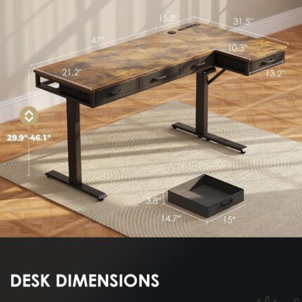 OffiGo 63 Inch L Shaped Electric Standing Desk with Drawers, Height Adjustable Large Desk with Power Outlets, Sit Stand Table, Writing Computer Desk for Home, Office, Workstation, Rustic Brown