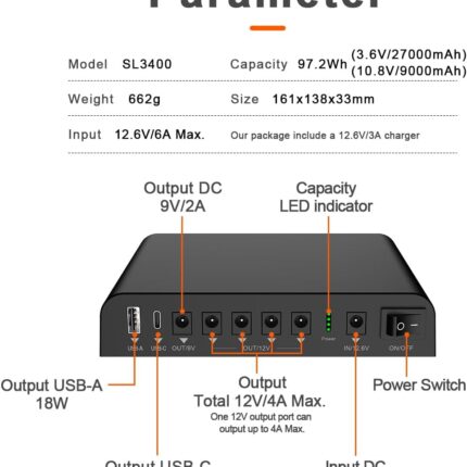 TalentCell Mini UPS Uninterrupted Power Supply 27000mAh 97.2Wh Lithium ion Backup Battery Pack with DC 12V/9V and 18W USB-A/USB-C PD Output for Router/Modem/LED Light, CCTV Camera, Smartphone and more