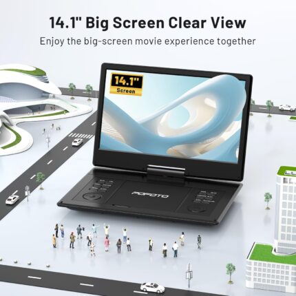 15.7″ Portable DVD Player with 14.1″ HD Swivel Screen, 6-Hour Rechargeable Battery, Dual Speakers, USB/SD/TV Sync, Supports Multiple Disc Formats, Black [Not Support Blu-Ray]