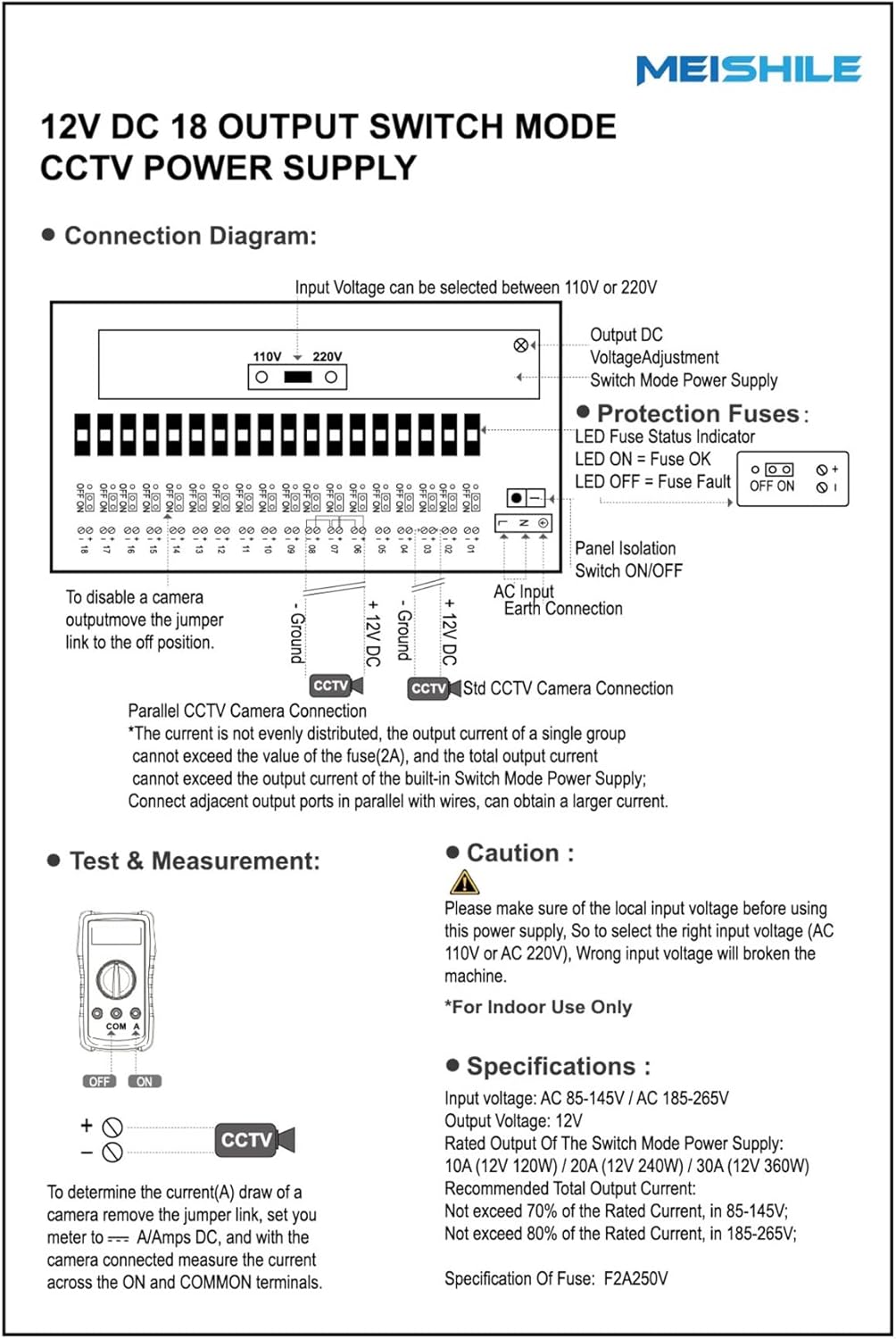 It offers a more professional alternative to individual power adapters; Support up 18 cameras; Individual LED power indication, the red light shorts indicator helps you know which is not working; Main power switch with integral surge protection; Individual PTC reset-able fuses output protection; Separate spaces for low voltage and high voltage operation to protect from high voltage damages Metal covered case with lock; Have 4 hanging holes for easy wall hanging;