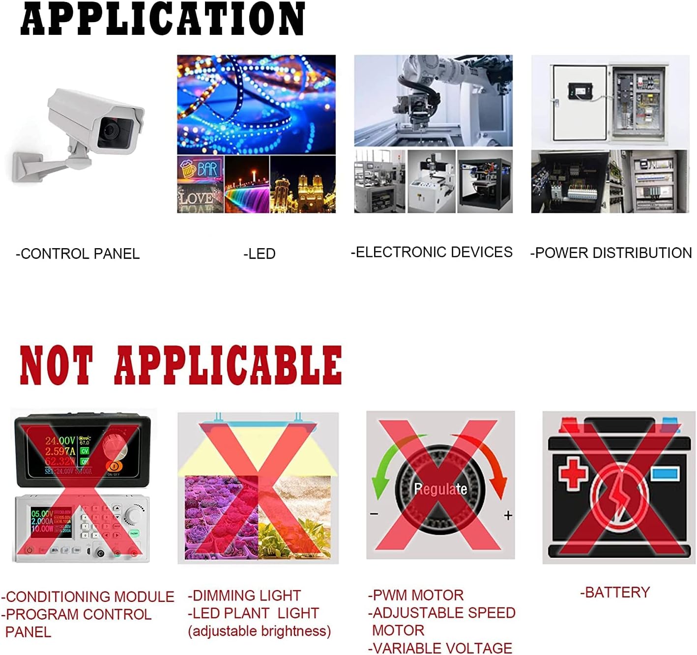 The maximum usage power don’t exceed 80% of the full load, otherwise the service life will be greatly shortenedIf it runs 24 * 7 hours, the power consumed should not exceed 40% of the full loadNot suitable for Speed-Regulating Motors / Charging Batteries