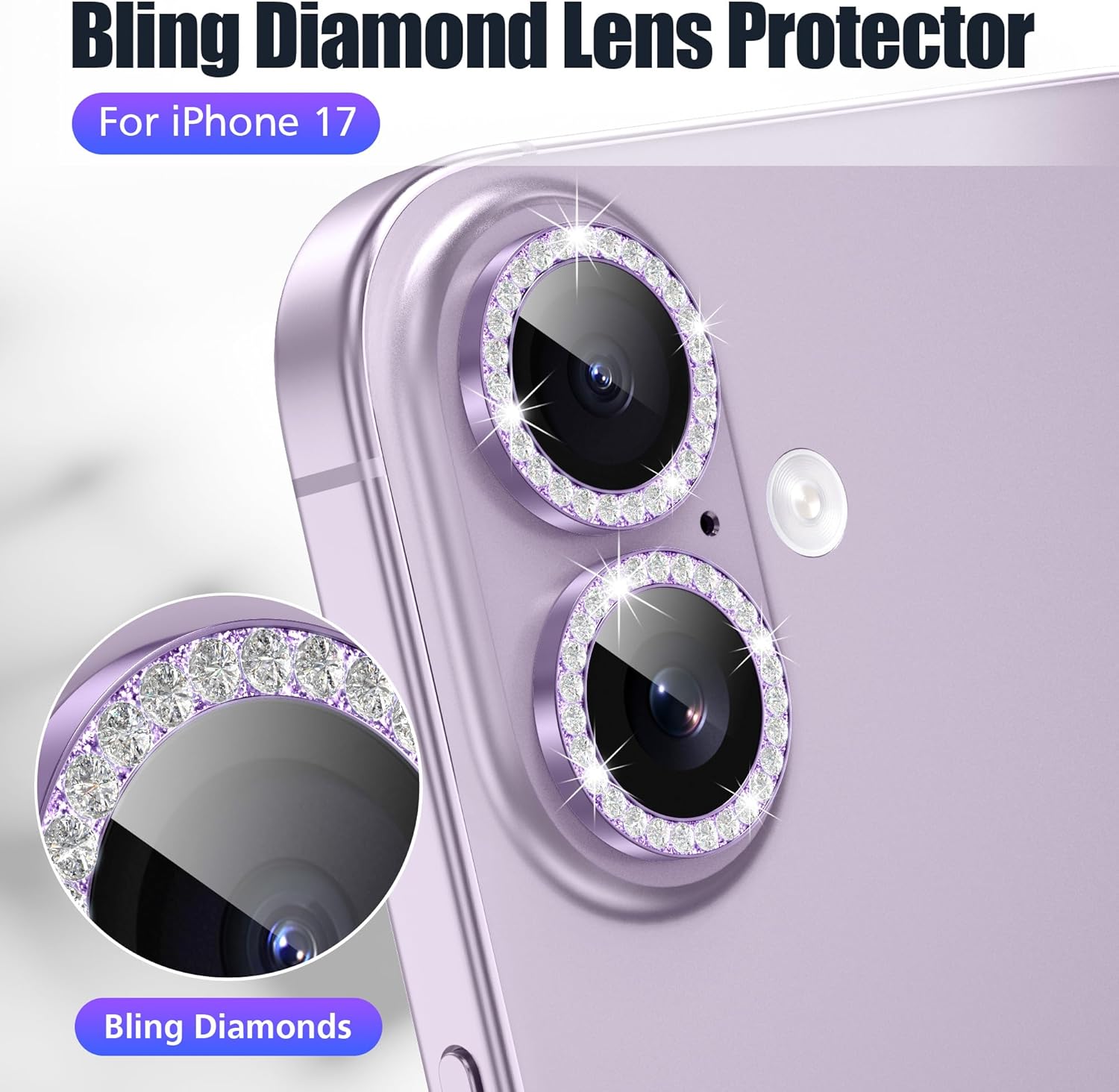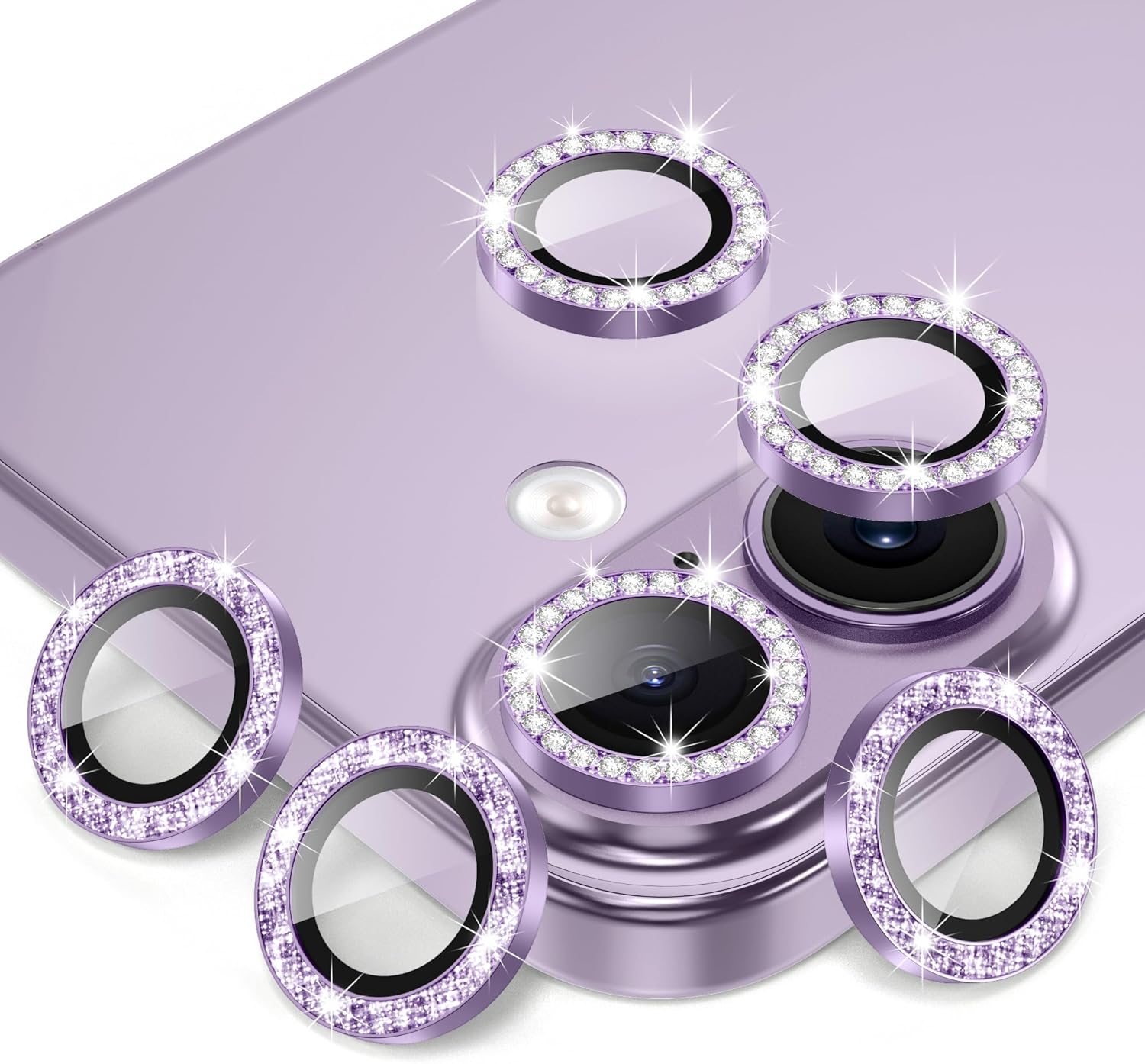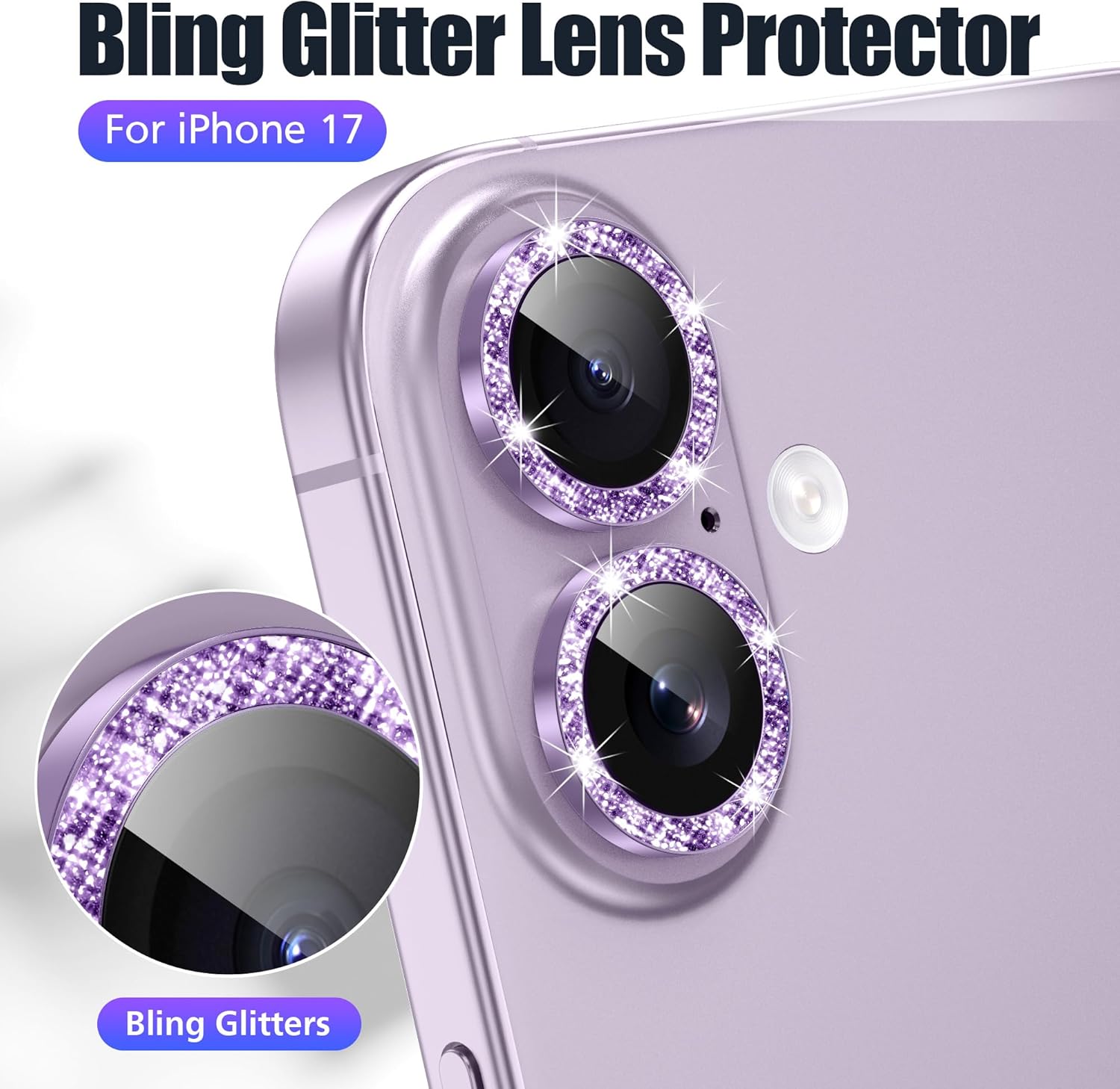 13 reviews for AGVEE 3+3 6 Pack for iPhone 17 6.3″ Camera Lens Protector, Bling Diamond & Bling Glitter Metal Ring 9H Tempered HD Glass Camera Cover Film, Bling-Purple