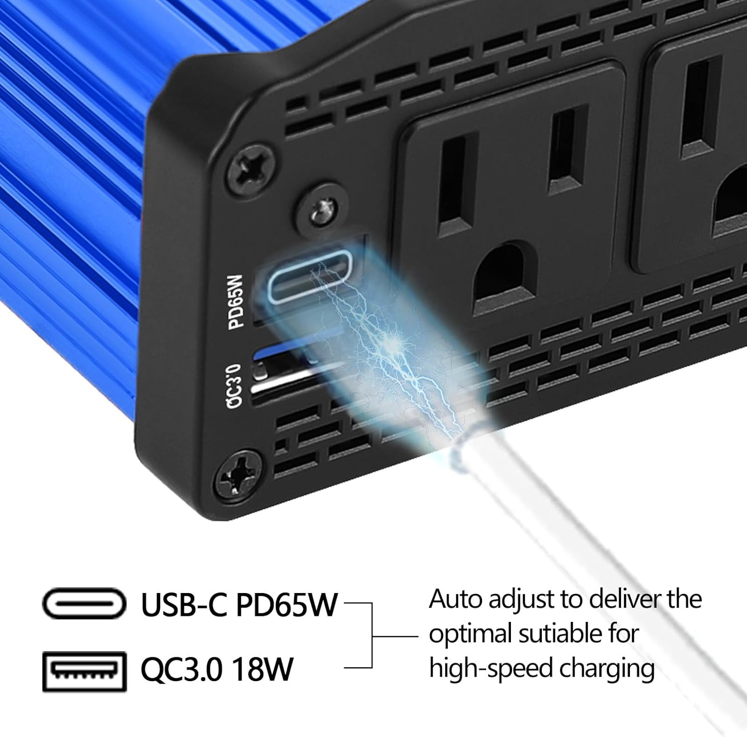 This Car Power Inverter with USB-C PD65W, auto adjust to deliver the optimal sutiable for high-speed charging. Enjoy fast charging with 65W max output for your laptop, iPhone, Samsung phones, and various other devices. If your device, (Such as Iphone 14) requires 20W, this USB-C port will automatically adjust to deliver the optimal 20W for high-speed charging.