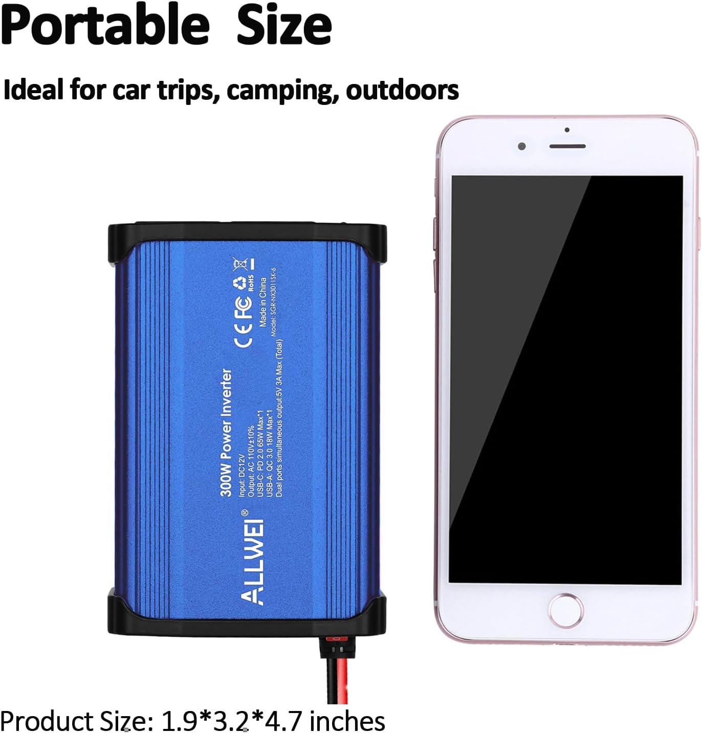 Color:BlueRated Power: 300WOutput waveform: Modifed Sine WaveOutput voltage: 110V ~ 120V AC 60HZ+/-2HzInput voltage: 12V DCUSB-C Output: USB-C PD65W*1,USB-A Output:QC 3.0 18W*1Length×Width×Height: 5*3*2inchPackage contents: 1 x 300W Power Inverter, 1 x User Manual