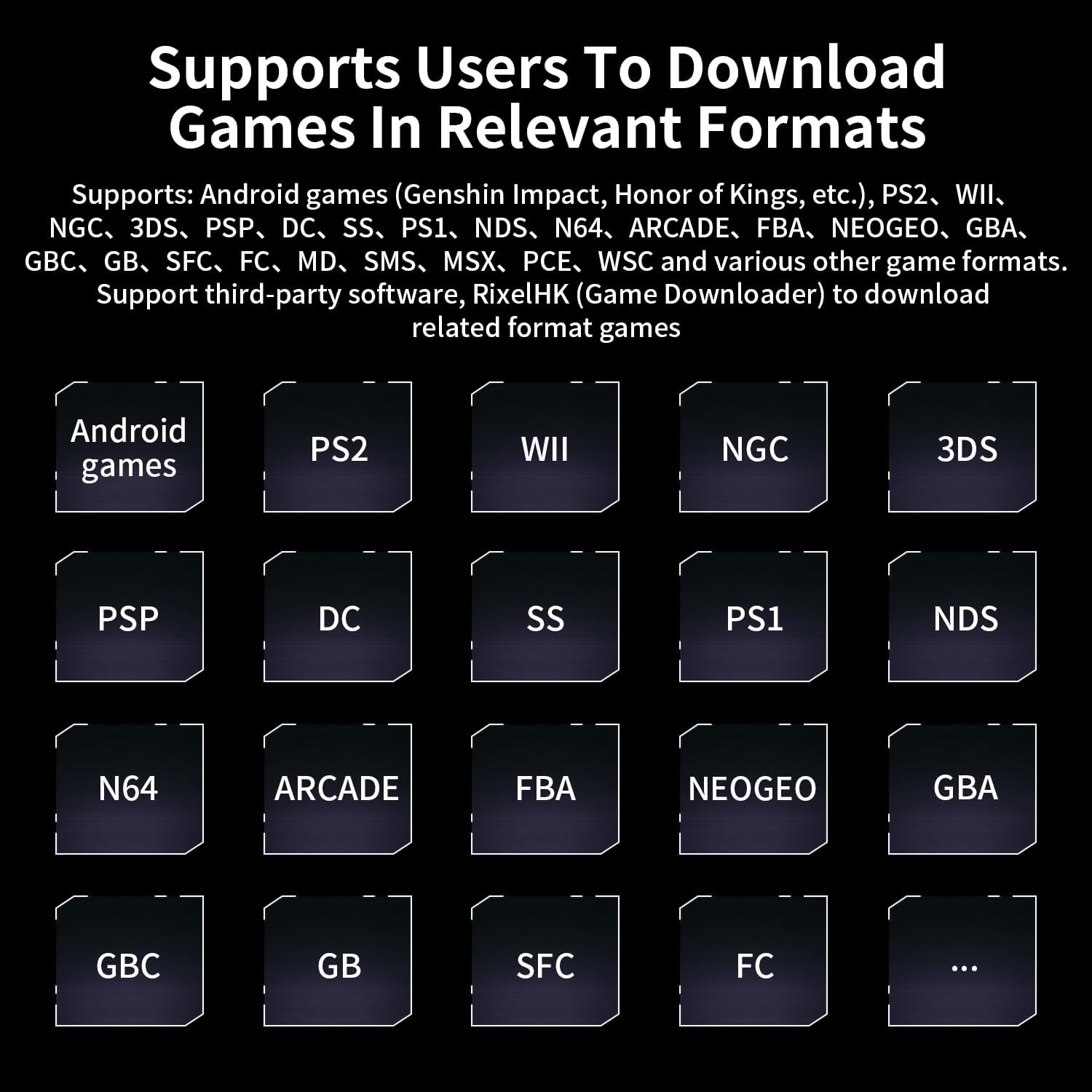 2. 【Android 13 System】NO GAME CARD – Please note that the RG476H does not come with a game card or any pre-installed games. The RG 476H retro game console handheld features a built-in game frontend for a richer gaming experience. It supports third-party software like RixelHK (a game downloader) and offers access to up to 30 popular emulator games and Android games. Users can also add their own games to the corresponding emulators.