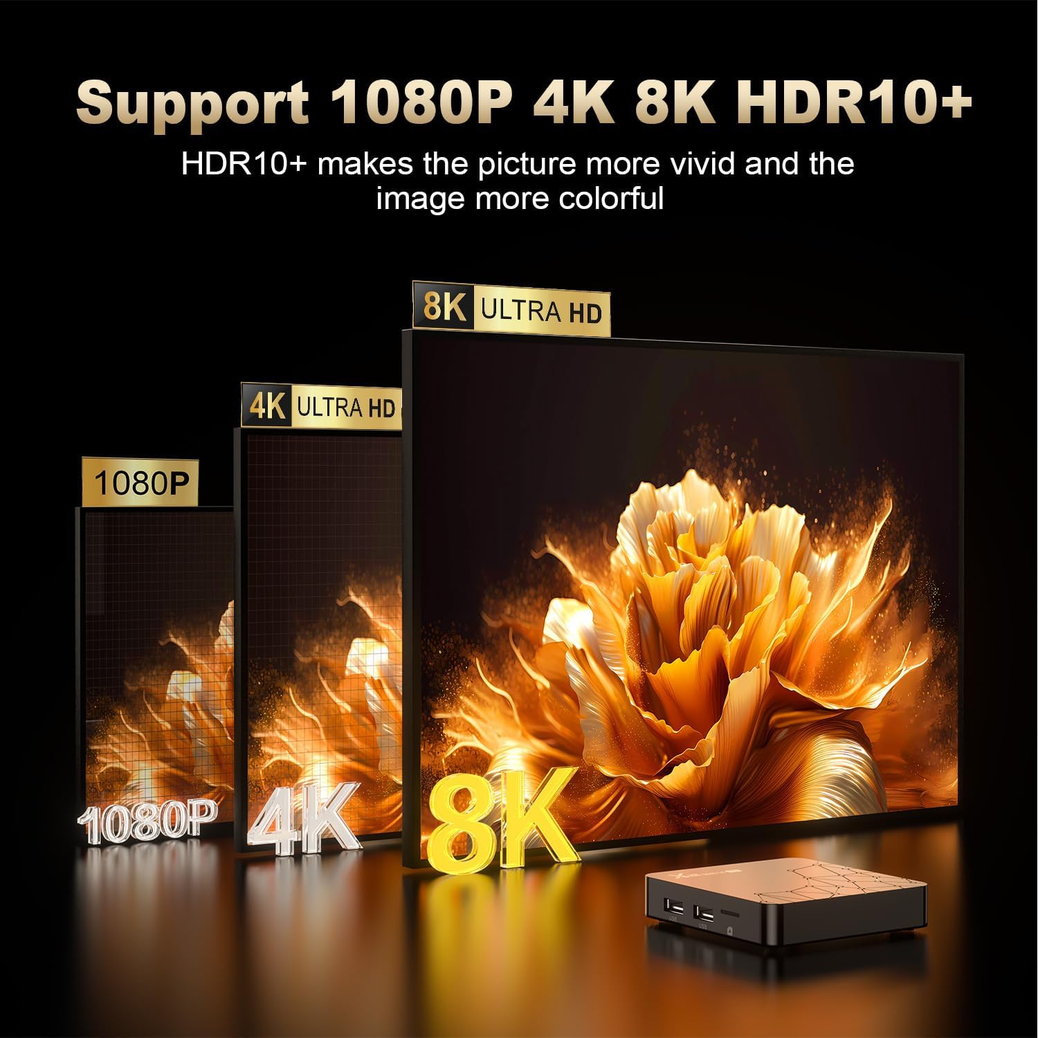 【4K 8K Ultra HD Resolution】Experience a new level of visual clarity with our Android TV box. It supports resolutions up to 4K 8K. Every detail on the screen is sharp and vivid, whether you’re watching high-definition movies, TV shows, or games. It offers four times the pixel count of 4K, creating a cinematic TV experience right in your living room.