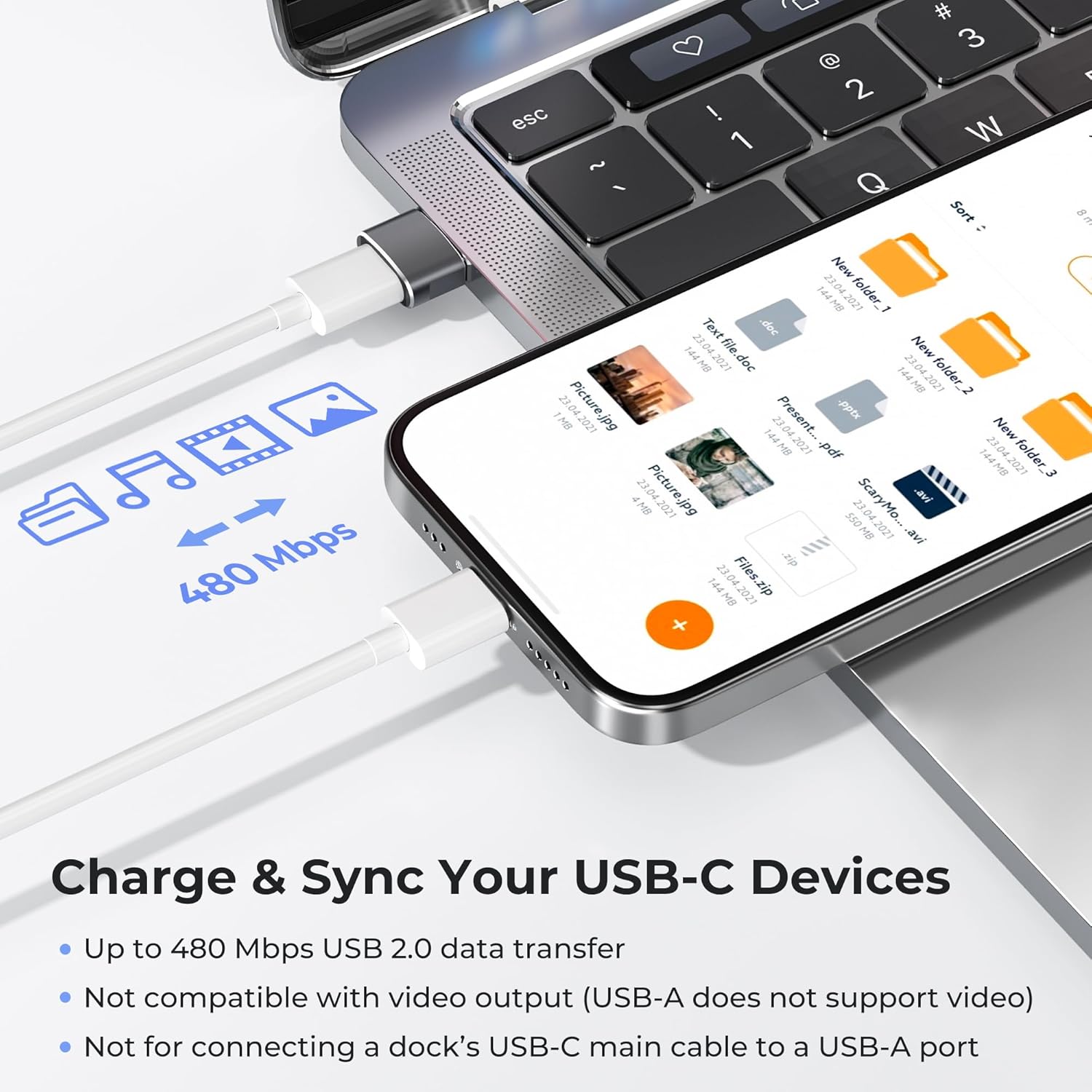 DESIGNED FOR USB 2.0 CHARGING & SYNC (NO VIDEO): Supports USB 2.0 data transfer up to 480 Mbps and charging up to 5V/2A, depending on your USB-A power source. Not for HDMI, DisplayPort, VGA, or any other type of video output, and not for driving a dock’s main USB-C host cable or high-power USB-C fast-charging protocols (PD/PPS).