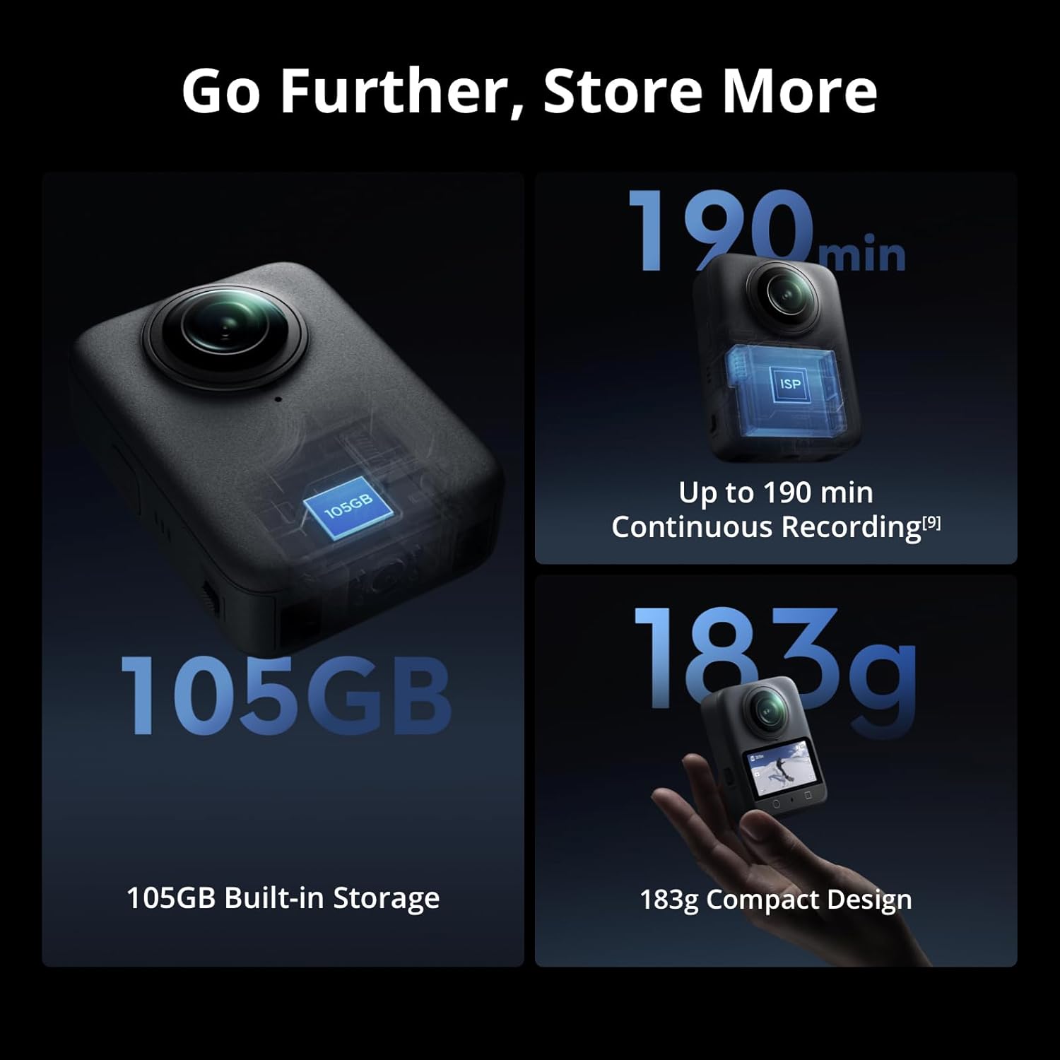 Always-Ready Action – Built‑in 105GB storage and up to 190 minutes [4] of nonstop recording let you shoot anytime without a memory card. From epic adventures to live events, your Osmo 360 never misses a beat.