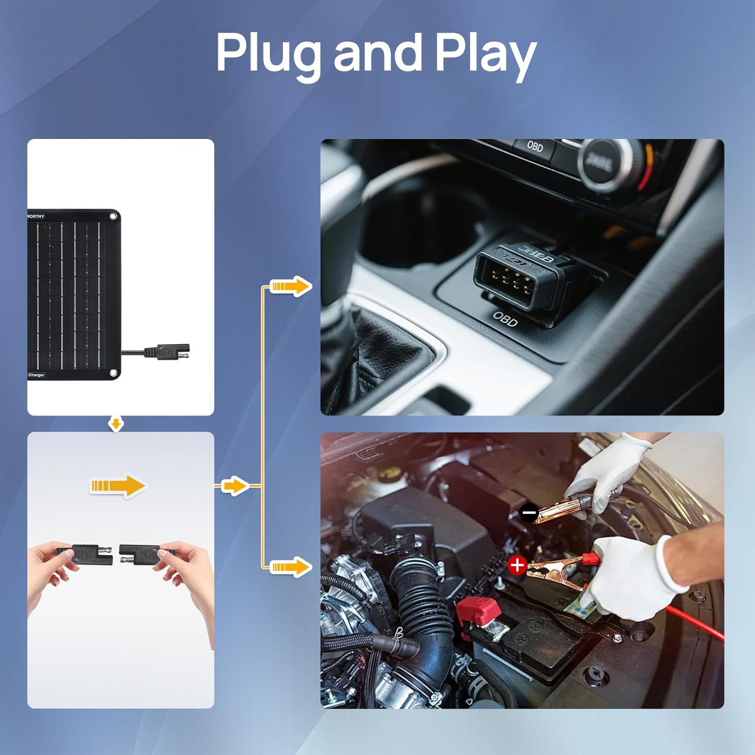 This little solar panel works wonders on my old pickup that I don’t drive much. It came with a plug that goes right into the OBD2 outlet and keeps my battery from draining. I just lay the panel on the dash and plug it in. Very satisfied with the item.