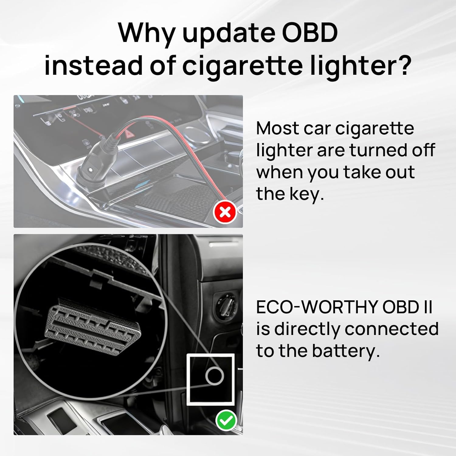 This is a great product because of the use of a obd plug into the engine diagnostic plug to provide solar power directly to the battery. No need for separate power from a 12 volt lighter plug to charge the engine battery Had a problem with missing parts and the company provided them in good order would buy from this company again!