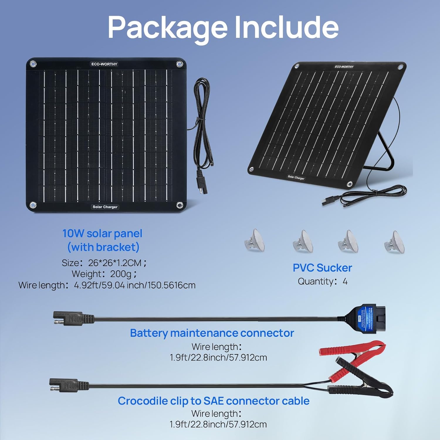 [ Worry-free Maintainer ] Choose from two solutions by ECO-WORTHY.There is no need to worry about vehicles that have been idle for a long time.This 10W 12V Solar Battery Charger, suitable for keeping vehicles/boat battery charged during the weeks unused.No need to disconnect the battery or have someone start the vehicle periodically. The indicator light on the back can observe the charging state. And it’s waterproof, you can safely use it outdoors(After experimental test).