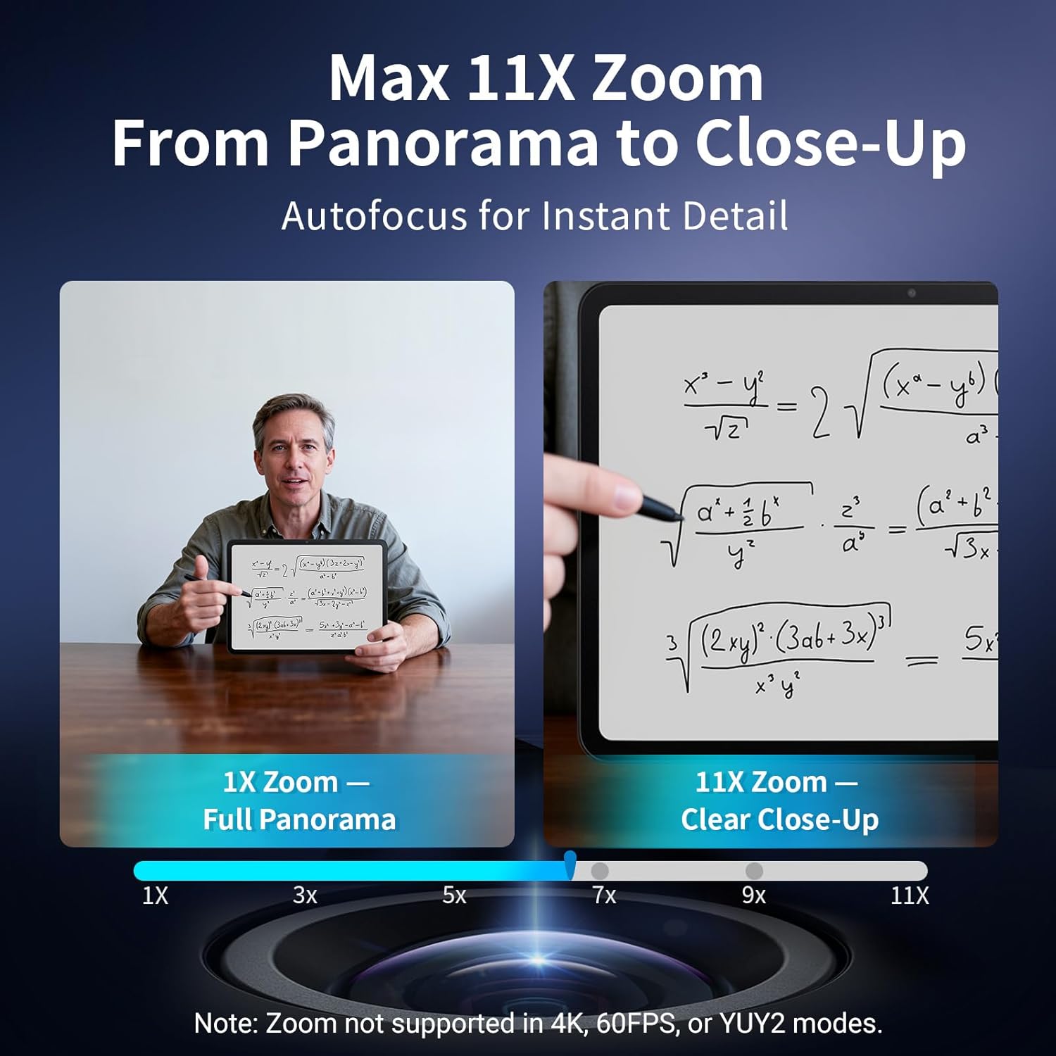 Max 11X Hybrid Zoom & PDAF Autofocus – The 4K webcam for PC offers smooth zoom from 1X to 11X—with examples like 3X, 5X, 7X, and Max 11X—for seamless transitions between full-scene and close-up views. PDAF autofocus keeps every zoom stable, clear, and fast. With remote or EMEET STUDIO control, the web cam enables flexible framing without moving the camera. Zoom not supported in 4K, 60FPS, or YUY2 modes. The integrated system saves time, space, and setup effort for a more efficient workflow.