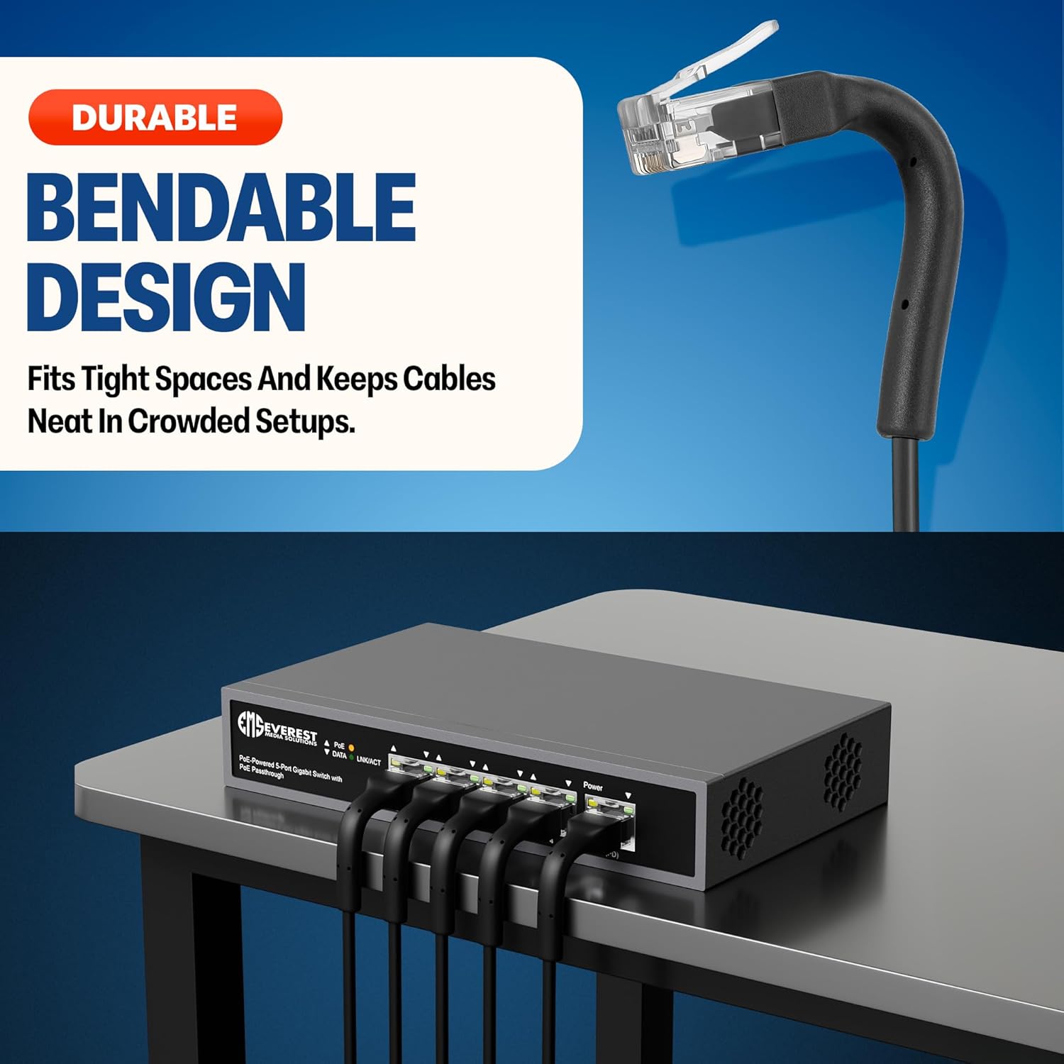 Bendable Strain Relief – Designed to protect the Cat 6a patch cable at its most critical bending point, our unique bendable boot prevents wear and tear, extending the life of your Cat 6a cable even in tight spaces while making installation a breeze