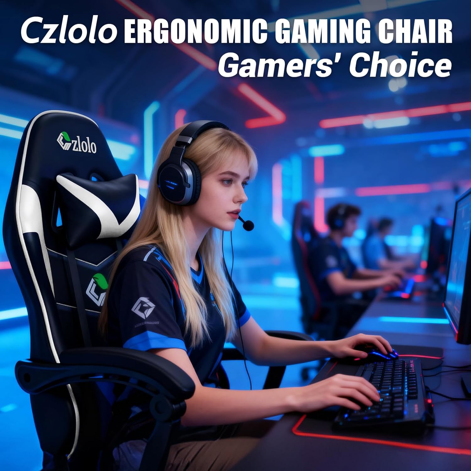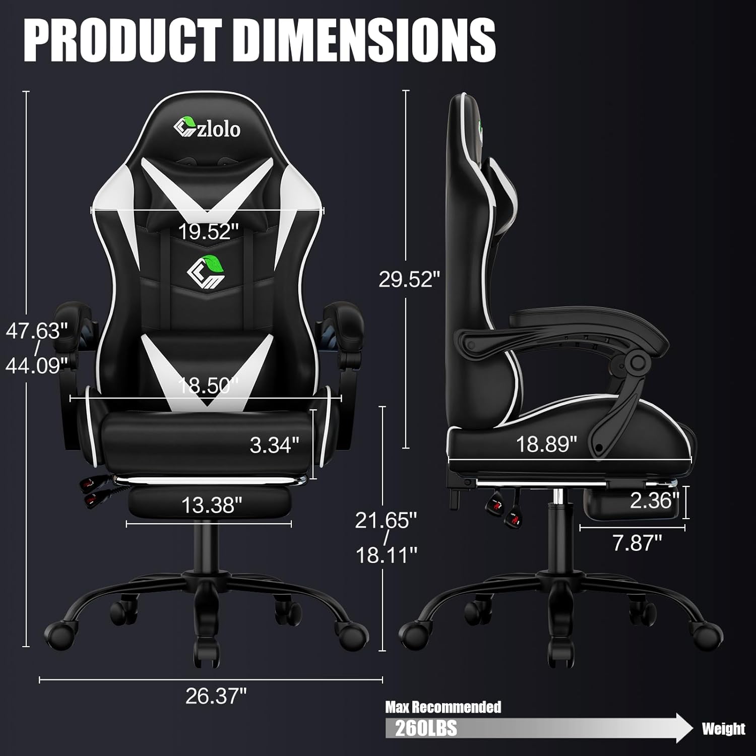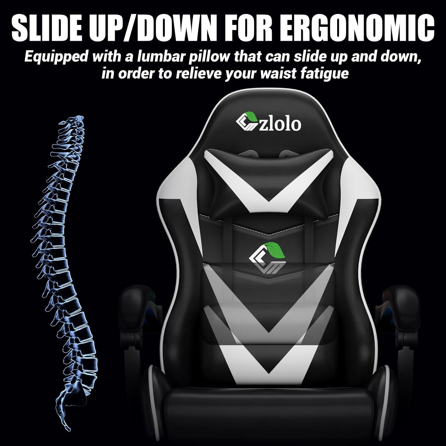 Ergonomic Black and White Gaming Chair: There is a small pillow on the top to protect your neck and avoid soreness. The backrest is widened to accommodate your shoulders, making you more comfortable to lean on. There is also an additional lumbar support massager that can vibrate to relieve your fatigue. The armrests have added sponge pads, which will feel softer when you lean on them.