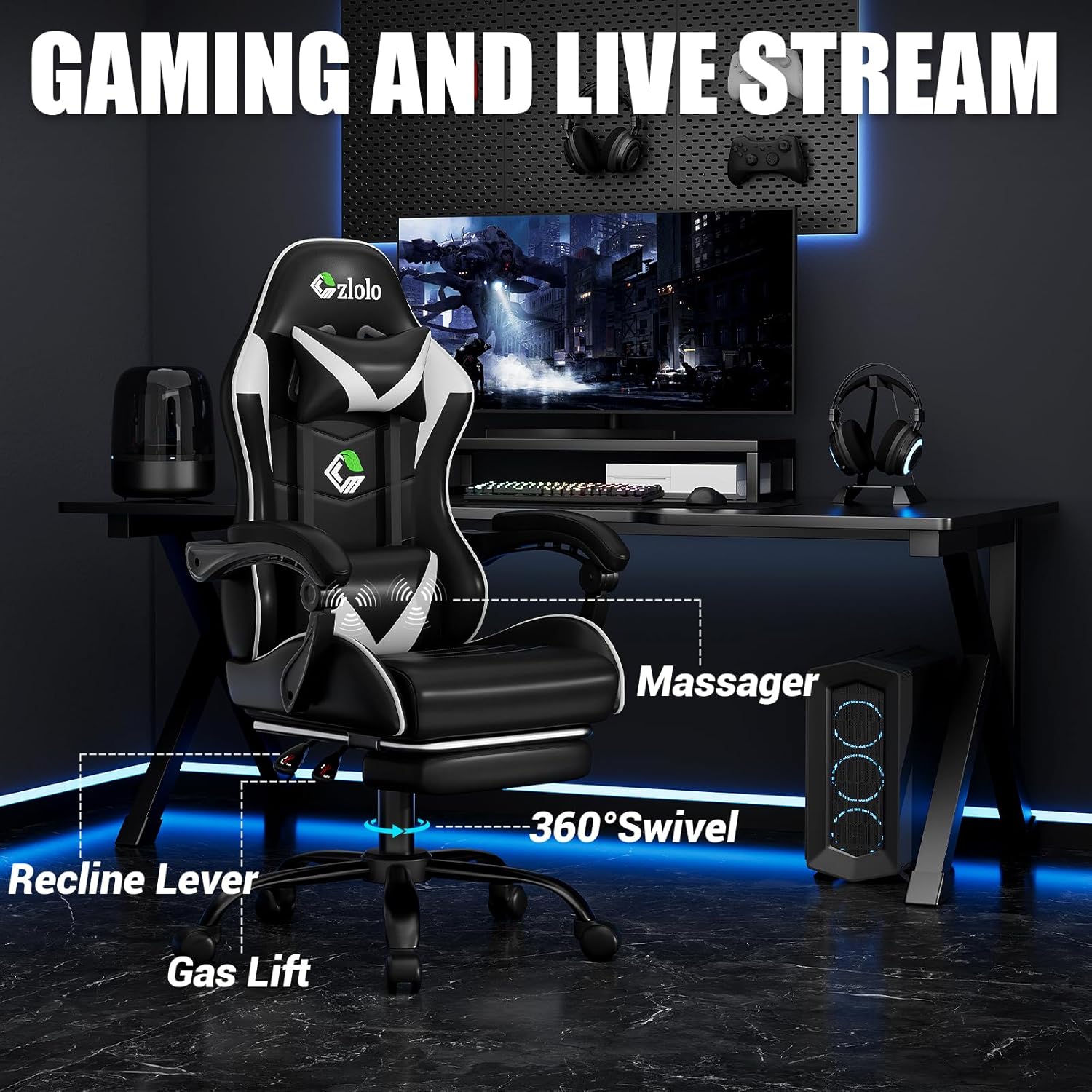 Gaming Chair with Footrest Racing Style Lumbar Support Massager Video Game Chair with Metal Legs, High Back Reclining Gamer Chair with Headrest, 360° Swivel Office Computer Desk Chair (White)