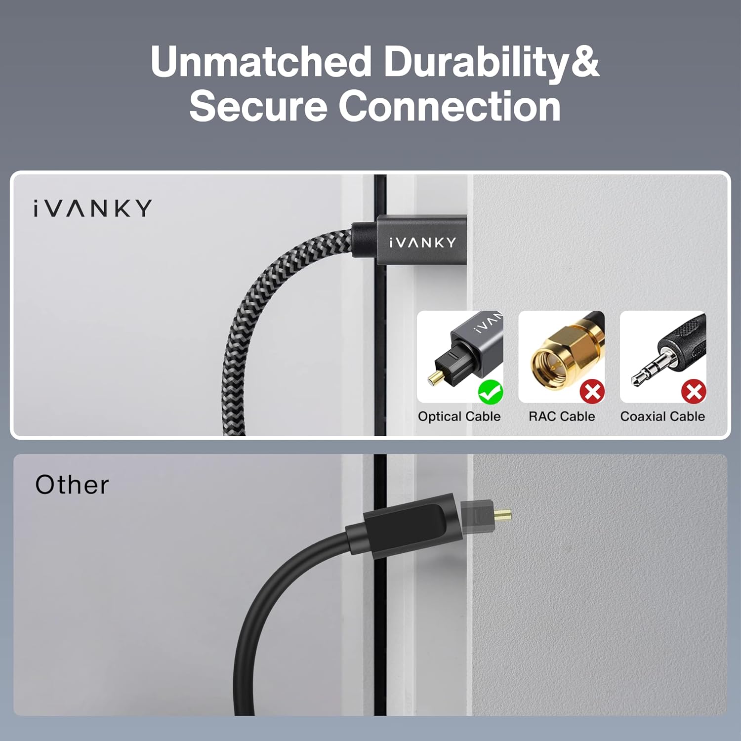 【Superior Durability】 Unlike conventional PVC jackets, iVANKY optical cable features a high-quality nylon braided jacket that withstands over 15,000 bends, making it highly durable and resistant to breakage. The aluminum shell and 24K gold-plated connectors prevent tarnishing and maintain conductivity over time, ensuring long-lasting performance