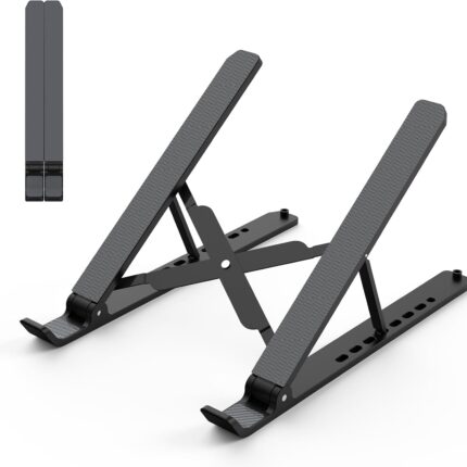 COMPATIBILITY: The laptop & tablet stand supports most devices from 10 – 15.6 inches: Macbook, ThinkPad, Surface, Chromebook, iPad Pro, etc.The laptop holder elevates your notebook from 2.15” to 5.6” height (6 level height) for a perfect eye level, letting you fix posture and reduce your neck fatigue, back pain and eye strain.