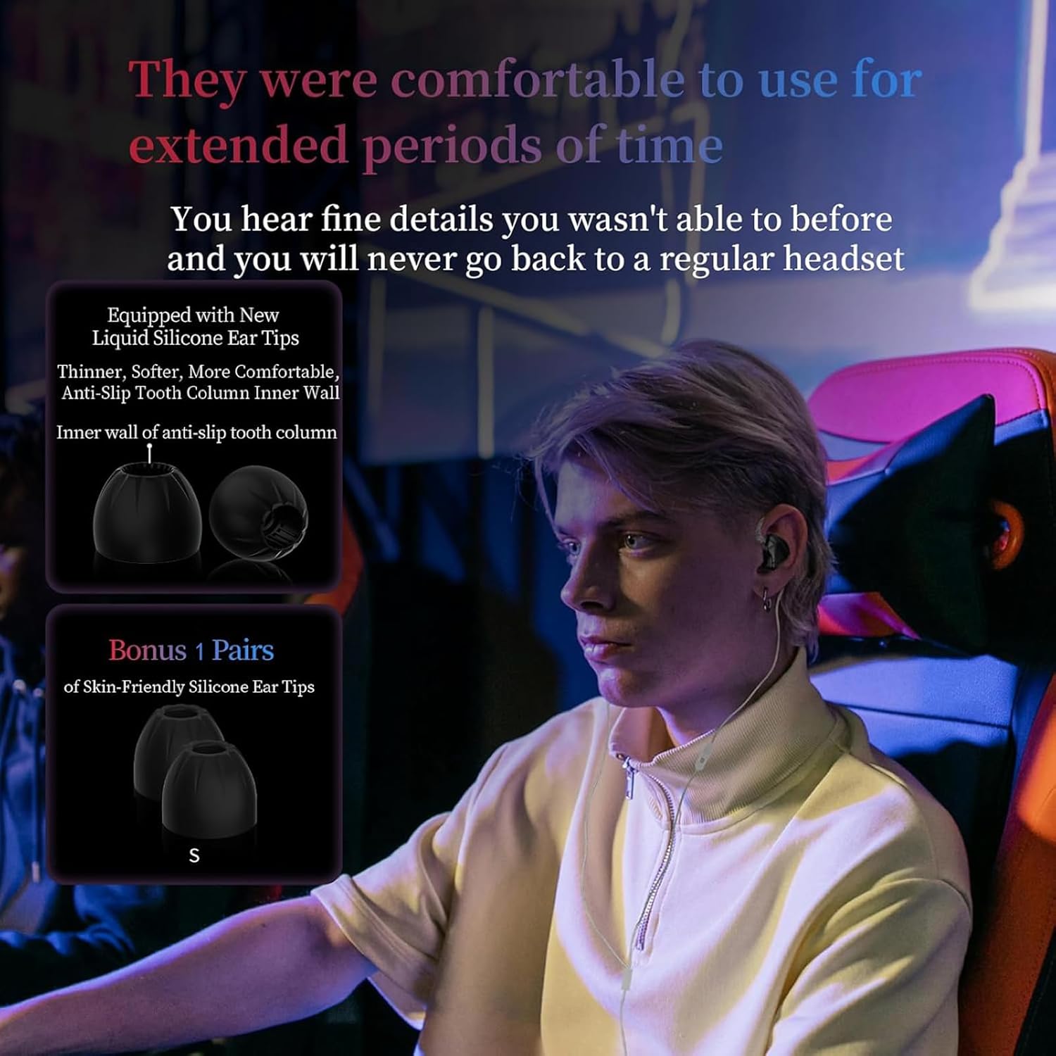 Comfort-fit and lightweight: Even the plushest headset will eventually create pressure points and heat up your ears. Ear-hook designed can be worn for hours with minimal fatigue and they’re light. These in-ear monitor gaming IEMs offer a fantastic balance of sound quality and comfort for extended gaming sessions