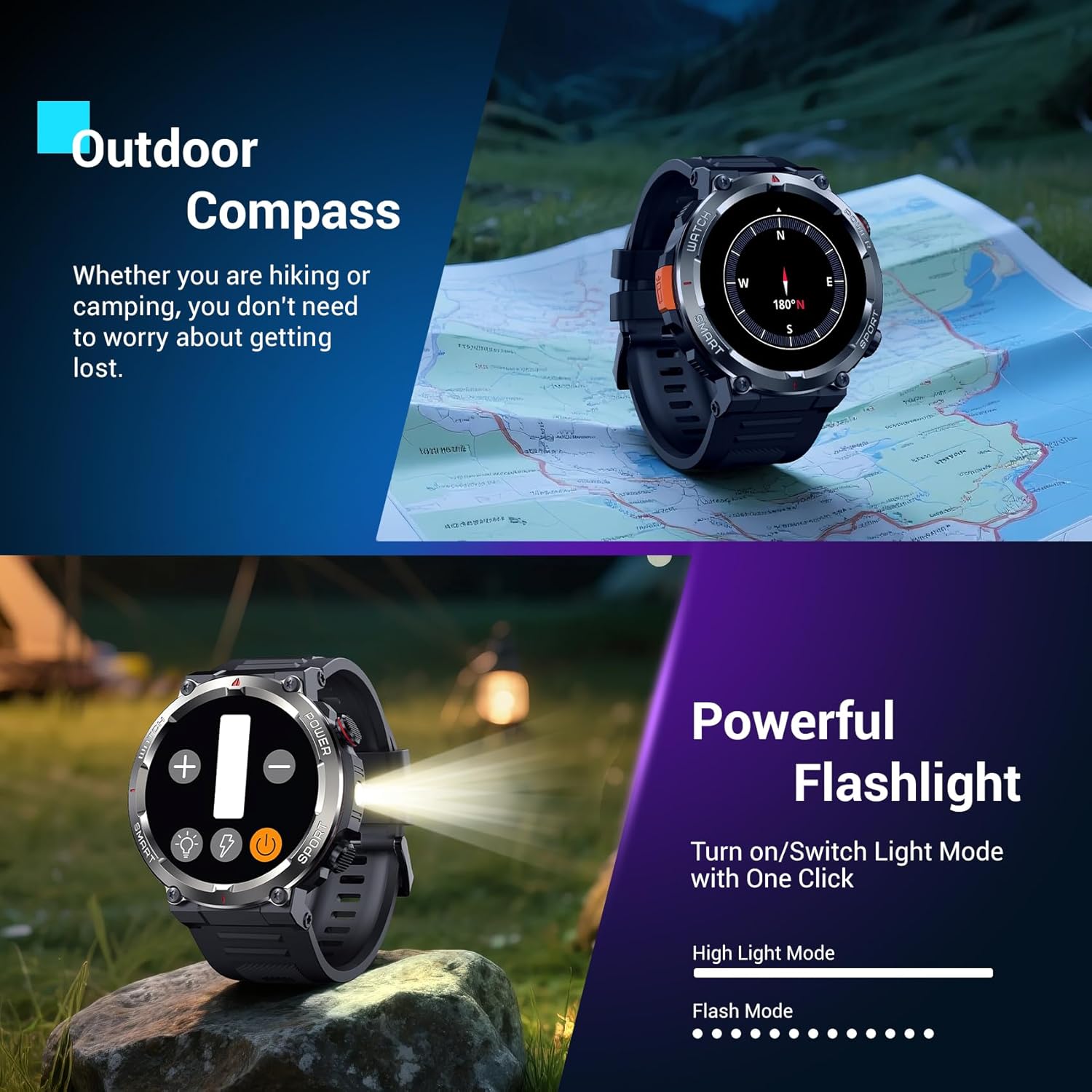 👍【LED Flashlight & Precision Compass】 This durable Blackview men’s military smartwatch features a built-in, high-brightness LED flashlight that activates with a single button for nighttime hiking, camping, or emergency lighting, eliminating the need for additional lighting. Combined with a precise compass, it allows for quick navigation when lost in the wilderness or without signal, providing safety and practicality for outdoor adventures, mountaineering, and military training.