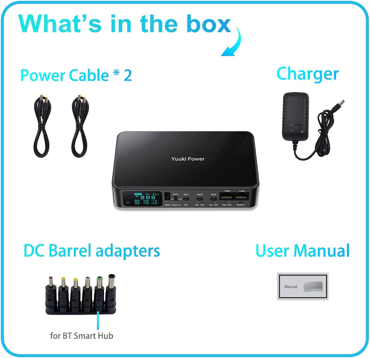 Works with DC 5V3.6A, 9V2A, 12V2A, plus PoE 15V1.3A or 24V0.8A for your CCTV. USB-A and USB-C ports support PD fast charging