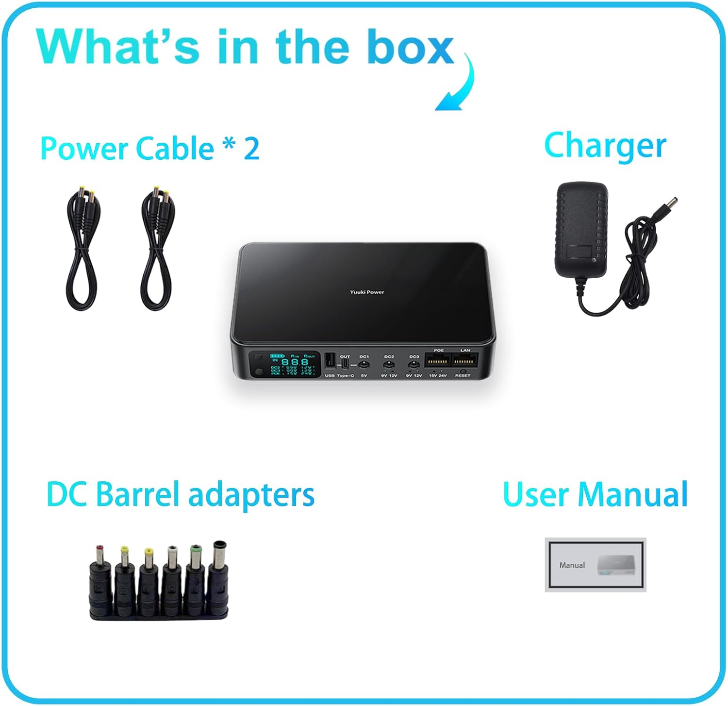 Comes with multiple DC barrel connectors, support 5.5×2.1, 5.5×2.5, 3.5×1.35, 4.0×1.7, 4.8×1.7, 6.3×3.0, and 6.3×4.0mm ports.
