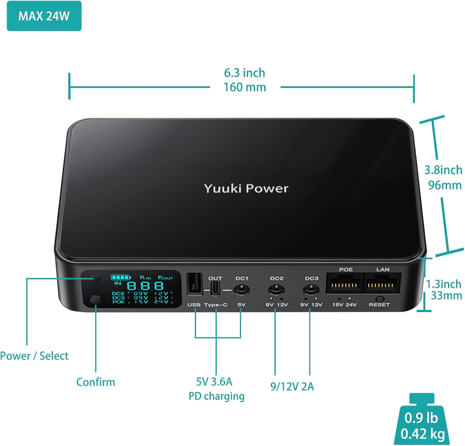 Works with DC 5V3.6A, 9V2A, 12V2A, plus PoE 15V1.3A or 24V0.8A for your CCTV. USB-A and USB-C ports support PD fast charging