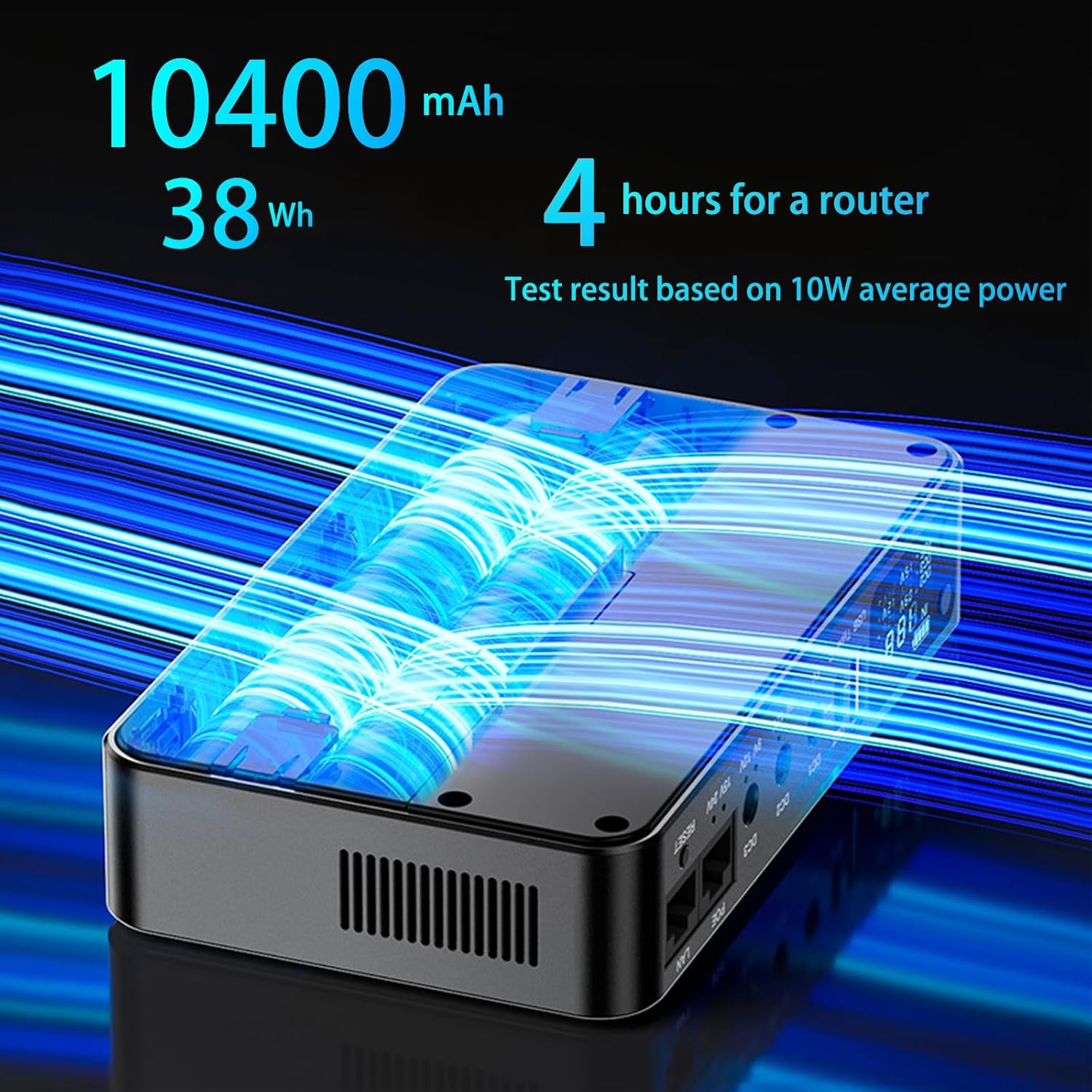 10400mAh (38Wh) battery backup provides hours of uninterruptible power for modem routers