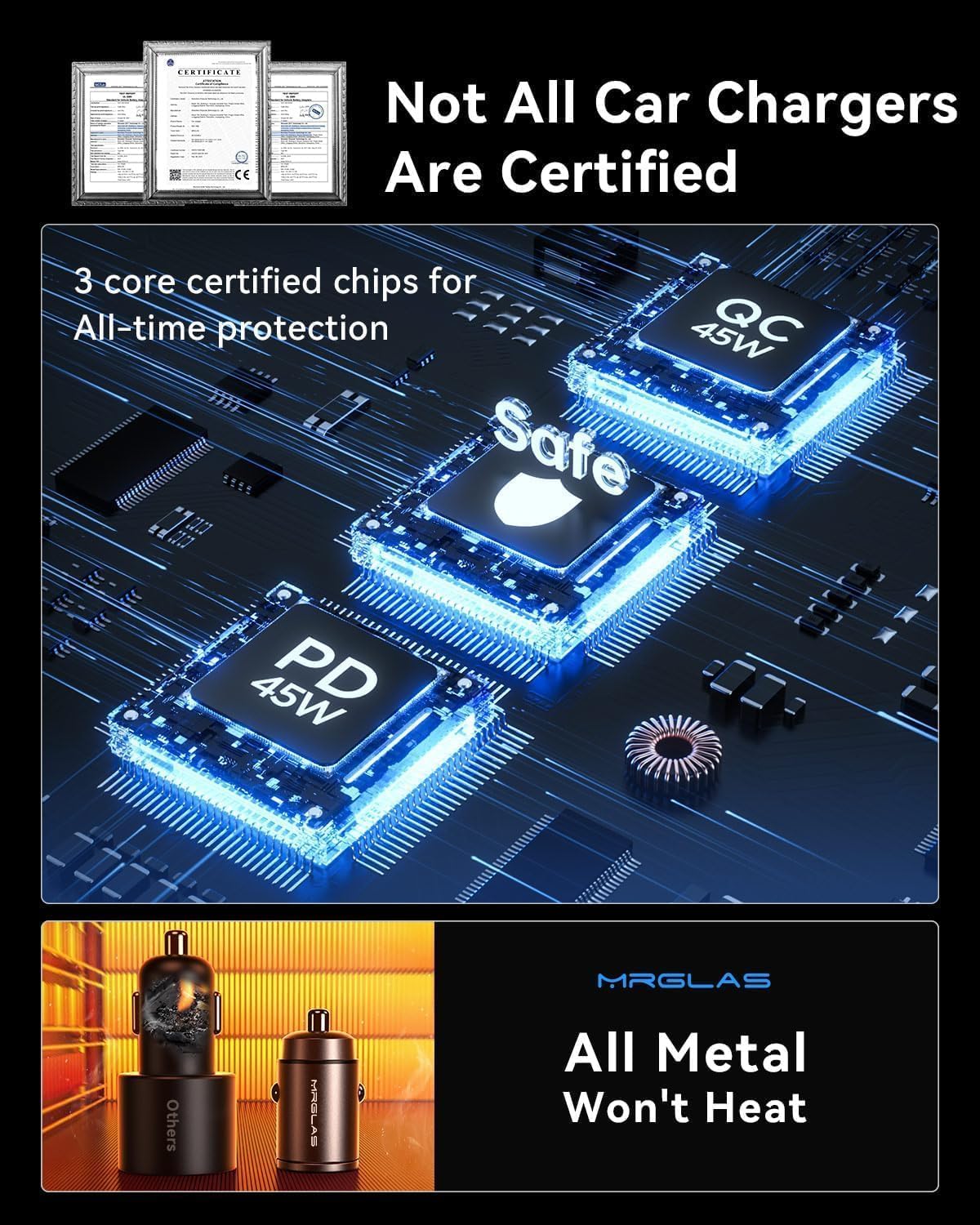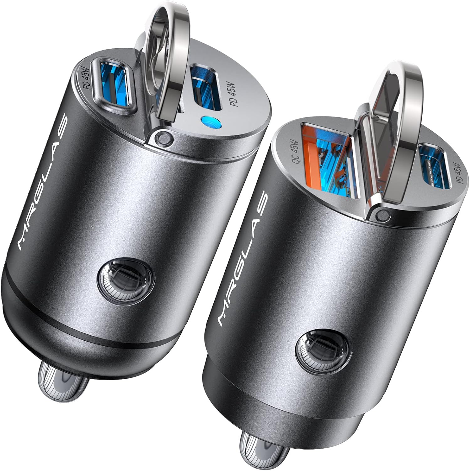 ⚡OFFICIALLY APPROVED PD45W+QC45W & DUAL PD45W FAST CHARGING: MRGLAS 90W fast USB C car charger supporting PD 45W(usb-c port) and QC 45W(usb-a port) high output, can fast charge all prevailing phones/iPad/tablet at the same time. Makes the IPhone 14 Pro Max and Samsung Galaxy S22 charging time from 0% to 88% in 30 minutes. ⚡DUAL CHIPS INTELLIGENT POWER SUPPLY: Built-in PD45W&QC45W/ PD45W&PD45W dual-core intelligent identification chip outputs 45W of fast charging current in each of its two cores, which is a safe and high-speed Fast Car Charger without damaging the device. NOTE: Supports simultaneous charging of 2 devices, but does NOT support simultaneous super-fast charging. 👍THUMB-SIZED, PULL RING DESIGN: The smallest flawlessly car charger on the market until now. With a tiny-sized body, fits snug and flush into the lighter outlet does not protrude which perfectly hides in your cigarette lighters. Never popup while driving and won’t block the cover of the cigarette lighter. So we designed a pull-ring to help you unplug from the car cigarette lighter easier. 💌WIDE COMPATIBILITY: USB C cigarette lighter adapter fast charger compatible with almost all popular car models and all Android/iOS and other devices like iPad/iPhone(45W), Samsung phone/tablet(45W), Fire HD, etc. Also work with car accessories like wireless car charger mount etc. 🎁ABOUT 2 PACK CAR CHARGER: First one equipped with USB A(45W) port and USB C(PD45W) port. The second equipped with 2-port USB C(45W). This is a great choice as gift for friends and family who have 2 cars. Smart people always prepare 1 extra car charger as an alternative, 2 packs can give you a sense of security. ❤️WE CARE FOR YOU❤️: This item comes with lifetime friendly customer service.
