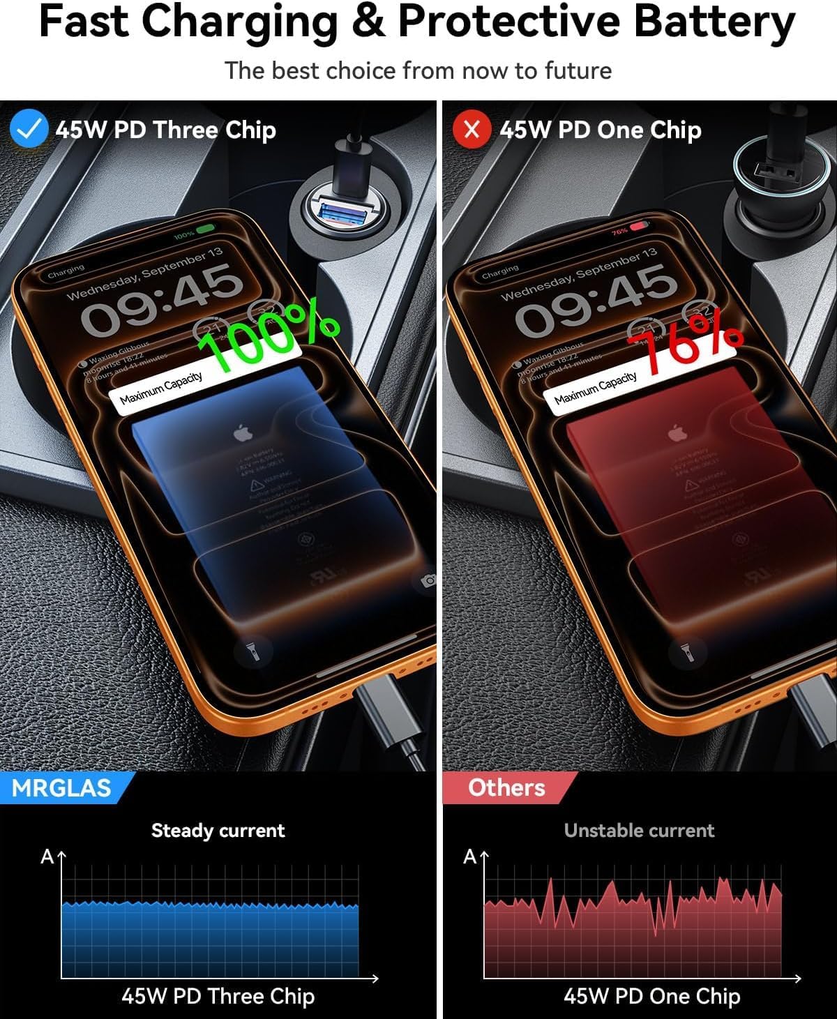 ⚡OFFICIALLY APPROVED PD45W+QC45W & DUAL PD45W FAST CHARGING: MRGLAS 90W fast USB C car charger supporting PD 45W(usb-c port) and QC 45W(usb-a port) high output, can fast charge all prevailing phones/iPad/tablet at the same time. Makes the IPhone 14 Pro Max and Samsung Galaxy S22 charging time from 0% to 88% in 30 minutes.