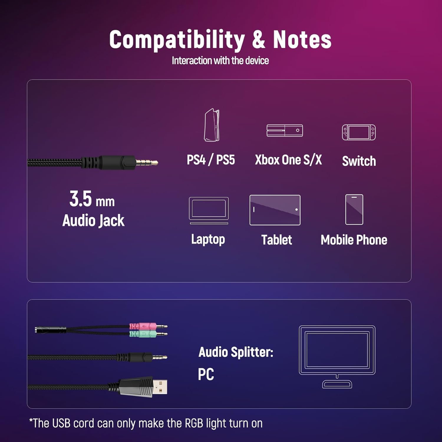 I use these for call of duty and youtube some times my oculus 2. The rgb works with a smooth fade out loop although it’s not addressable rgb it’s pretty nice they even send adapters so it you want to power the rgb when your on xbox or ps5 it’s independent from the controller power source (batteries) for pc you can just hook it up.Con the volume and mute switch on mine usually faces inward not a huge problem but sometimes moving around with raise or lower the volume a minor inconvenience if I would have designed it one would be on each side instead.Pros decent sound quality yesterday it saved me from being shot from behind in cod mw 2.0 the surround sound is decently crisp. The company is eager to please to to make sure you like it by the time I got it and started using it after a week they were checking up on how I liked it. After a couple messages back and forth he/she told me about the rgb being independent from the jack. Most of the rgb wired headphones I’ve seen aren’t separated and only work on the pc. Now even watching TV (I have a projector) I can use the rgb. Microphone works as it should noise canceling I never hear complains from other players. The top fabric for comfort is comfortable I’m keeping the plastic they package it with to keep it clean. Each ear side get an addition inch approximately of length for people with bigger heads. The plastic ear cuffs are not going to flex unless to beat it with a heavy object the head band has just enough flex to it. And the microphone can be moved as it’s flexible but also turned all the way pointing up . The head jack and usb splitter is pretty long about 6ft or so and it comes with a quality velcro cord piece to roll up for non use meaning if you wanted to you could put it on a headphone stand and hide the cords from you cat so it’s not dangling.Suggestions to the company slightly thicker ear cups would be nice I got big ears so they kinda touch the inner fabric of the cuff and if I squeeze a little bit there’s a little but of suction in my ears. Change the volume scrolling wheel to a sliding one and put it opposite of the microphone mute switch.Possible issues sometimes the microphone doesn’t register on cod mw 2.0. However this is more likely to be call of duty chat program than the headphones because it happened multiple times with other headphones as well.