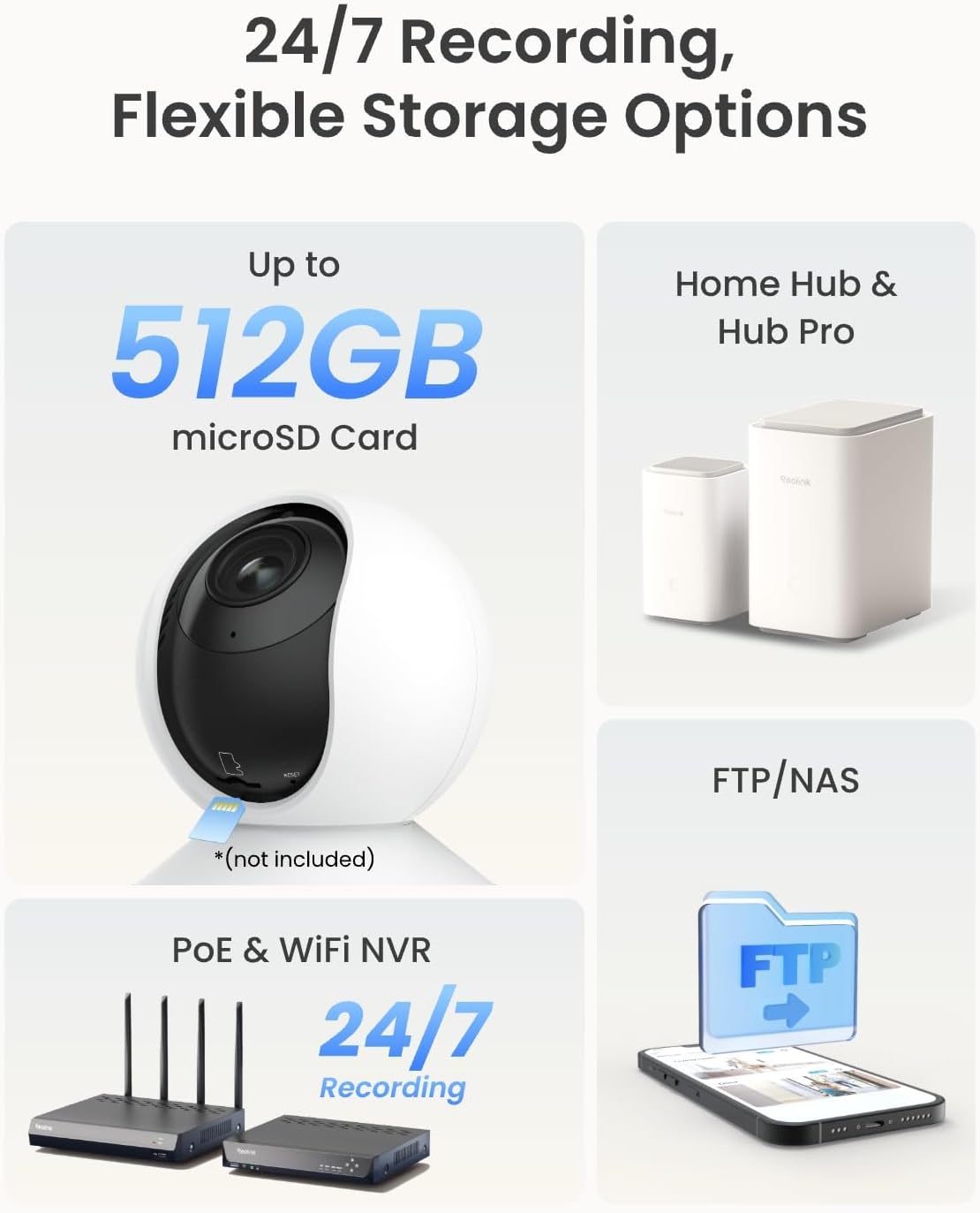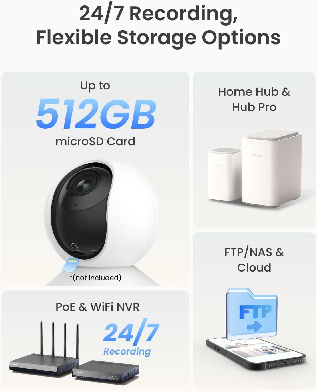 Supports up to 512GB microSD card, Wi-Fi & PoE NVR, Home Hub Series, FTP/NAS (RTSP/ONVIF supported).