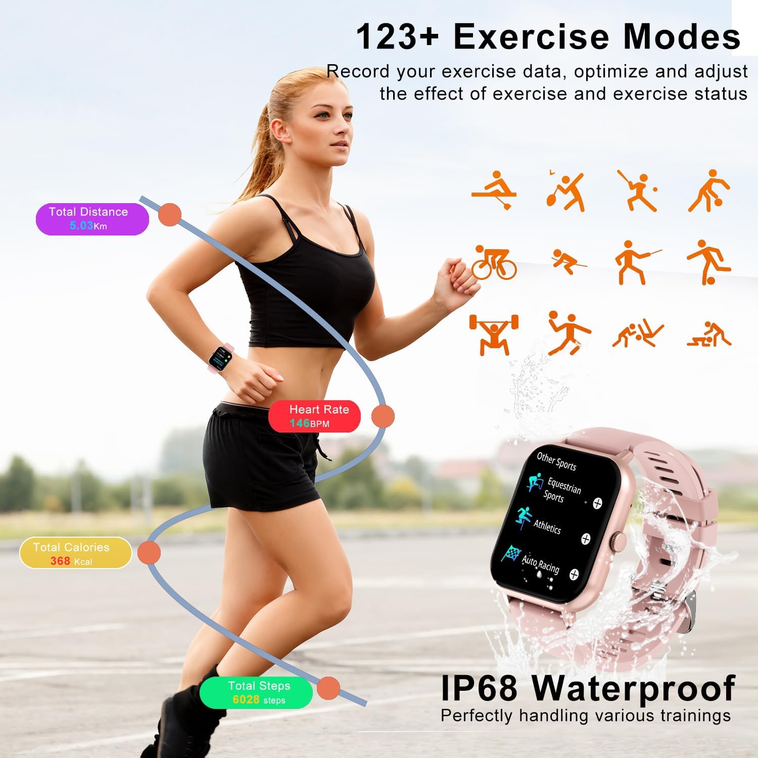 ⌚【IP68 Waterproof & 123+Sports Modes】:This women’s watch has IP68 waterproof, you don’t have to worry about the watch’s normal use, even while swimming, washing your hands, or exercising in the rain. Built-in 123+ kinds of regular motion modes. It can also provide data on 8 types of exercise, according to different exercise modes, the data such as steps, exercise time, GPS exercise track(smartwatch APP View), calories, exercise heart rate tracking, mileage and so on are displayed respectively.