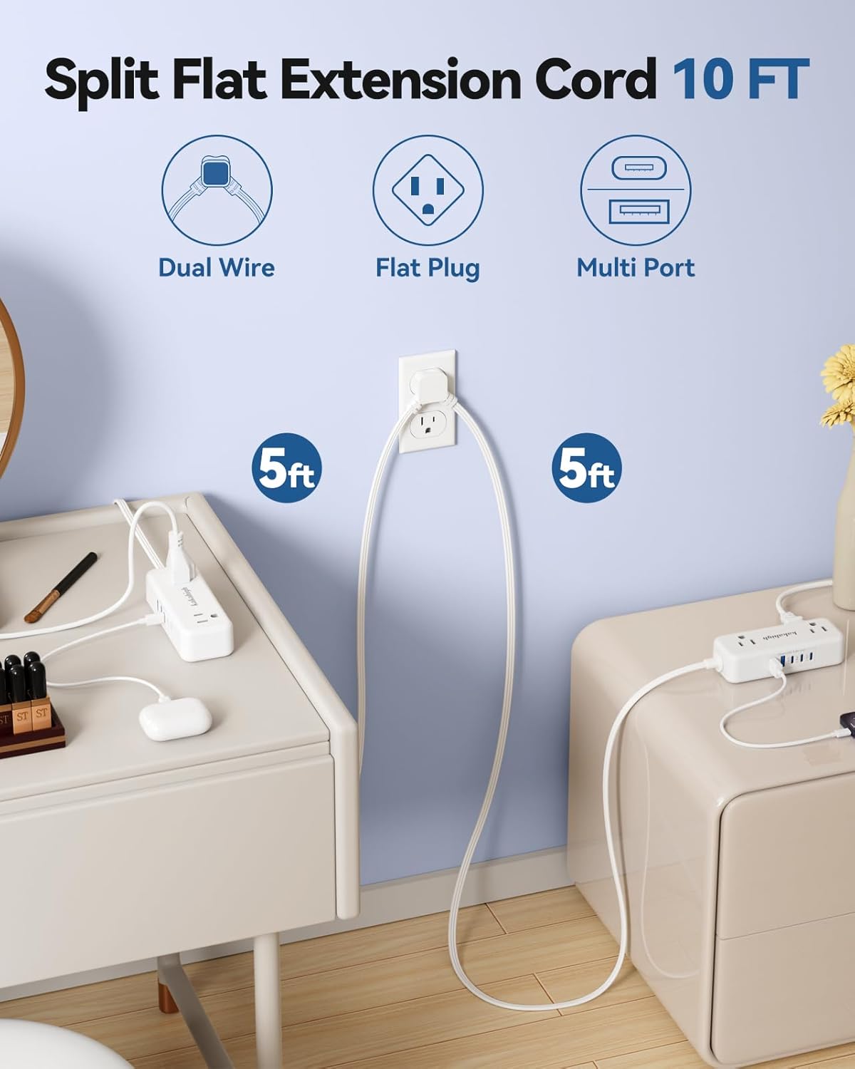 Split Extension Cord 10FT (5FT on Each Side), Single Flat Plug Twin Extension Cord with 4 AC Outlets, 2 USB-A & 3 USB-C(24W/4.8A), Nightstand Charging Station for Bedroom Dorm Room Home, His and Hers