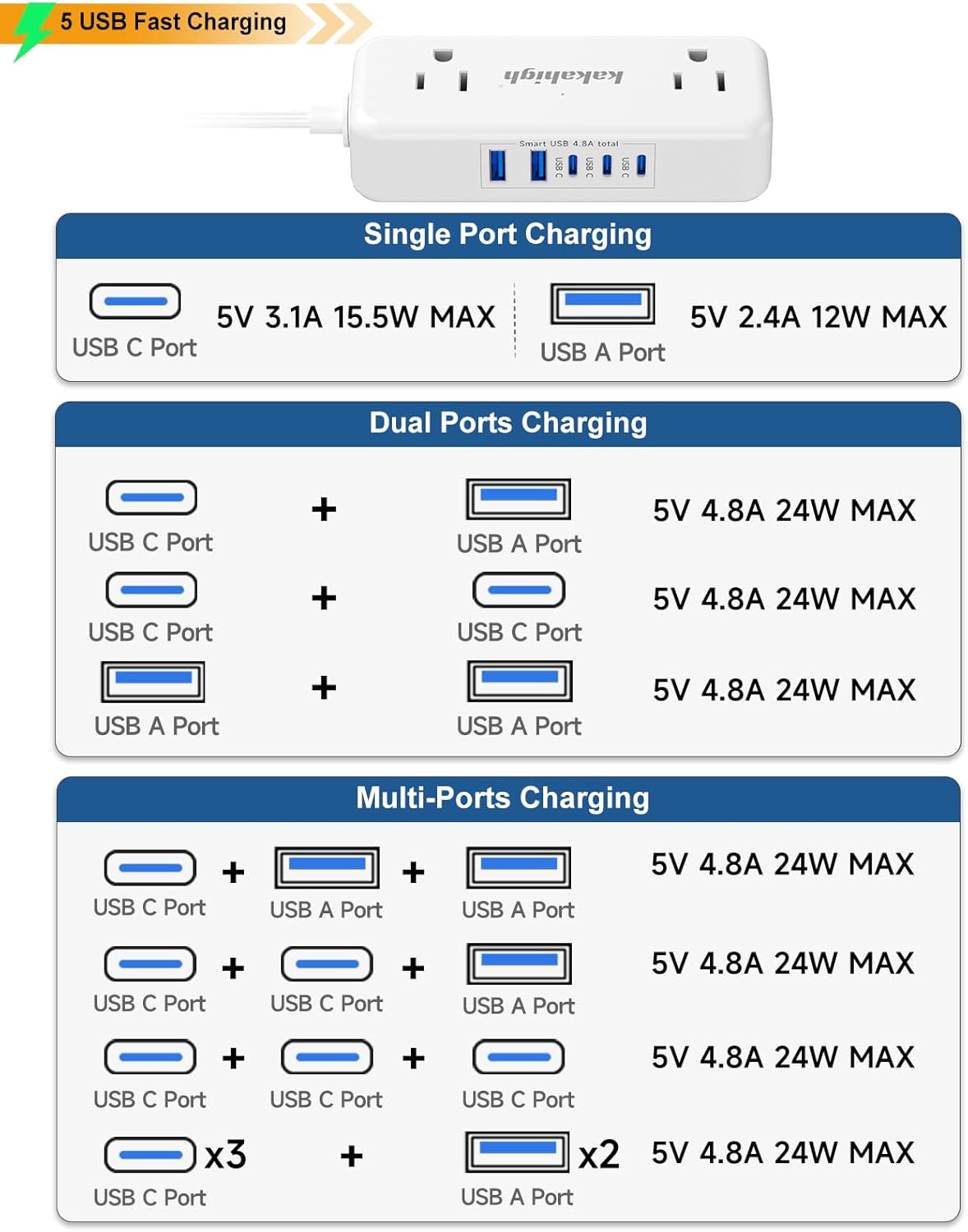 【Extension Cord with USB C Ports】Compare with other 15W power strips, the dual extension cord provice 3 usb-c for Apple devices, each can charge up to 5V/3.1A,15.5W Max, all usb ports output is 5V/4.8A, 24W max. Multiple ports extension cord with smart charging technology, it can automatically detect your connected devices and can achieve faster charging efficiency, which would charge your devices WITHOUT a variety of converters.