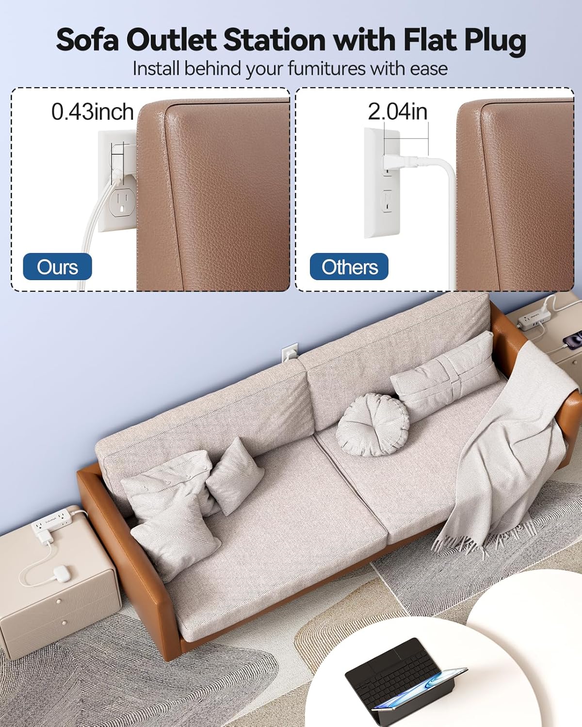 【 Compact and Lightweight】At only 1 Pound, 4.9*1.8*1.2 inch mini size*2, 0.43 inch slim head and 90 degree right angle design, which is much slimmer than traditional plugs, can close to the wall easily and hide in the back of furniture, no waste for outlet and space.
