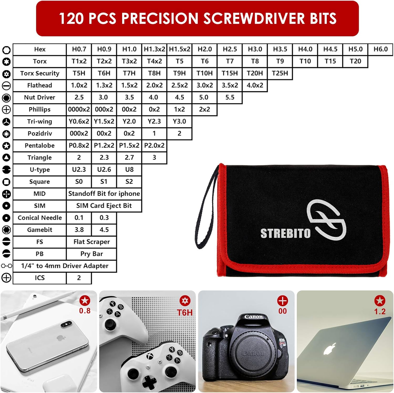 120 Precision Bits: Phillips, Flathead, Torx, Tamper-Resistant Torx, Pentalobe, Pozidriv, Tri-Wing, Hex, Gamebit, etc.