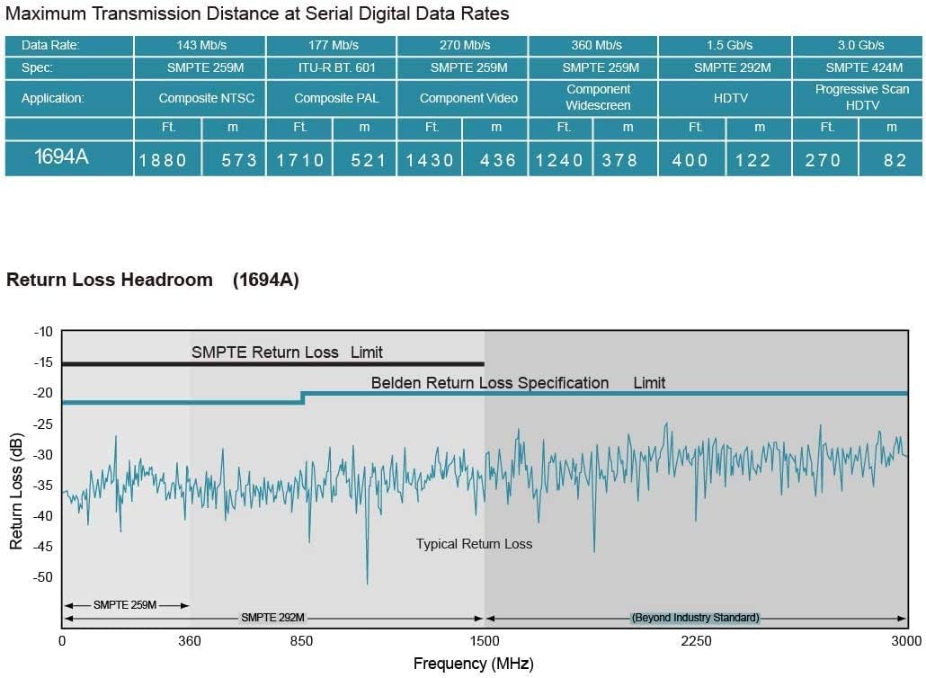 Belden 1694A Low Loss Serial Digital Coaxial Cable is an RG6 coax designed to carry several video signals including analog, 4×3 digital (SD-SDI), high definition (HD-SDI) and even 3gig (1080p/50 or 1080p/60). The center conductor is made from true 75 Ohm 18AWG solid copper.