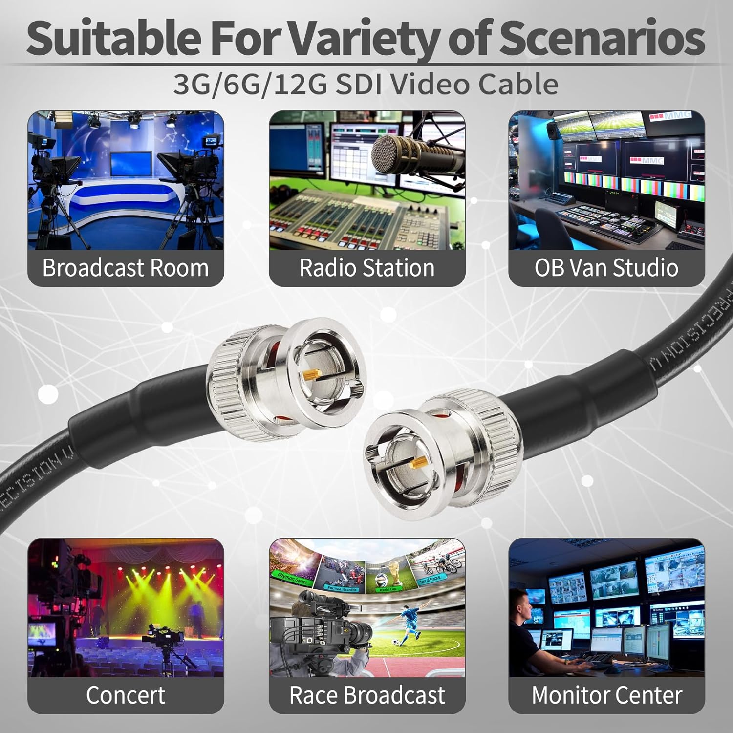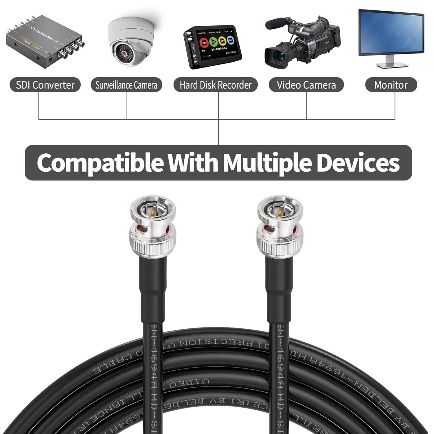 This long sdi cable Is suitable for HDTV and professional SDI applications: Supports HD-SDI, 3G-SDI, 6G-SDI,component, composite, MADI, WORD CLOCK, SYNC, etc.This shielded coaxial cable is compatible with Blackmagic, AJA, Grass Valley, Evertz, Marshall, Atomos, Postium, AVID Converter .Our HD-SDI cable is great for HD-serial digital video transfer, HDTV upgrades, sdi cable tester, video capture card and SDI video eyc.