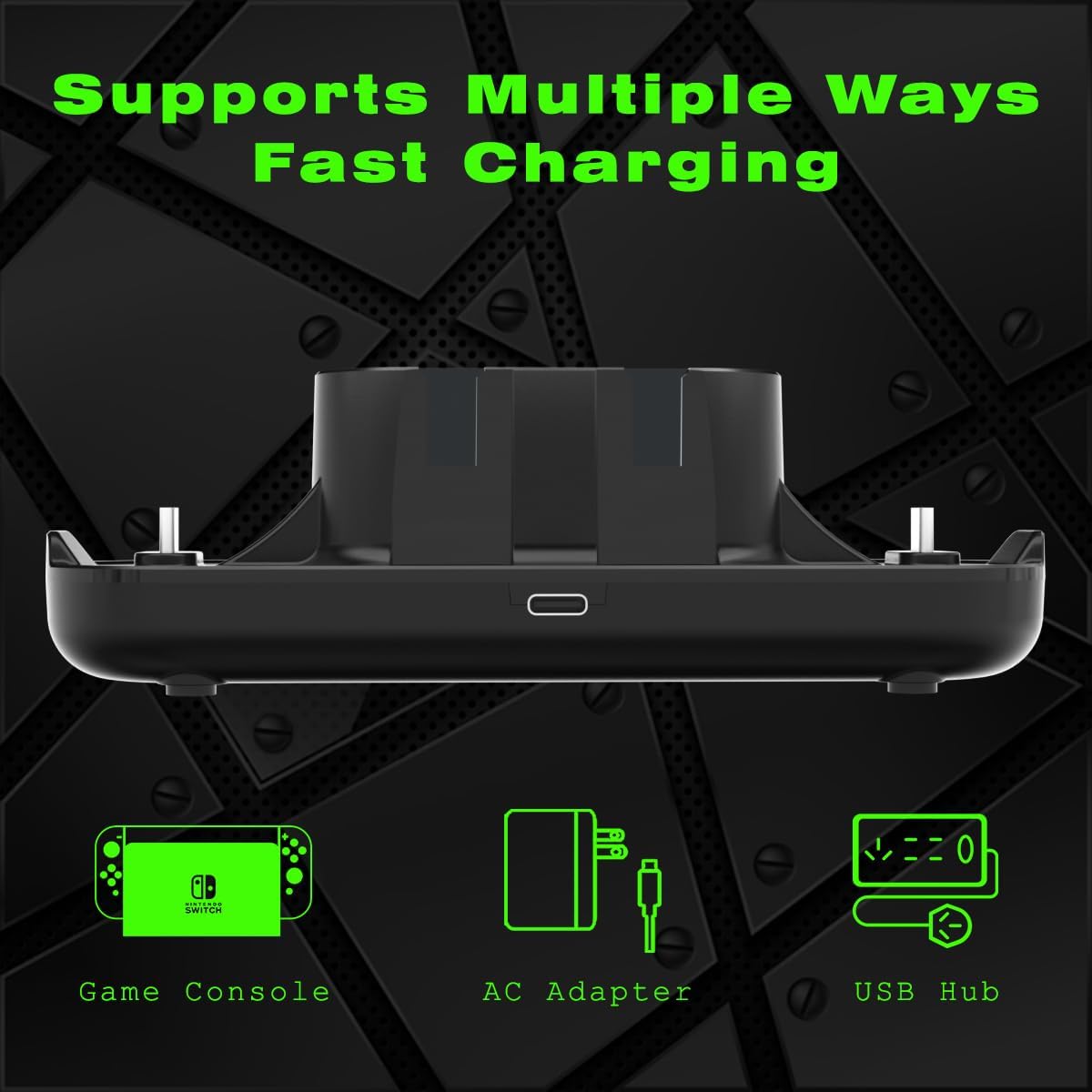 ### 5-Star Review for Controller Charging Dock for Nintendo Switch Joycon**Rating: ⭐⭐⭐⭐⭐**The Controller Charging Dock for Nintendo Switch Joycon has been a fantastic addition to my gaming setup. Here’s my detailed review of its performance:**Pros:**1. **Simultaneous Charging:** This dock can charge up to four Joy-Cons at once, which is incredibly convenient. No more rotating controllers or waiting for a pair to charge before starting a multiplayer session.2. **LED Indicators:** The LED indication lights are a great feature. They clearly show the charging status of each Joy-Con, turning from red to green when fully charged. This eliminates any guesswork and ensures my controllers are always ready to go.3. **Compact Design:** The charging dock has a sleek and compact design, taking up minimal space on my gaming station. It fits neatly alongside my Nintendo Switch console and adds a bit of organization to my setup.4. **Compatibility:** It’s fully compatible with both the standard Nintendo Switch and the Switch OLED models. This versatility is a big plus, especially for those who might upgrade their console in the future.5. **Durable Build:** The build quality is sturdy and reliable. The Joy-Cons fit securely into the dock without feeling loose or wobbly, and the entire unit feels well-constructed.6. **Included Charger Cable:** The inclusion of a charger cable is a nice touch. It’s long enough to reach my power outlet comfortably, and I didn’t have to purchase an additional cable.**Cons:**1. **No Fast Charging:** While the dock charges Joy-Cons efficiently, it doesn’t offer fast charging capabilities. However, given the extended battery life of Joy-Cons, this is a minor issue and doesn’t impact my overall gaming experience.2. **Fixed Position:** The Joy-Cons need to be docked in a fixed upright position, which can be a bit restrictive if you have a cluttered setup. Ensuring a clear space for the dock helps mitigate this issue.**Overall:**The Controller Charging Dock for Nintendo Switch Joycon is an excellent accessory that delivers on its promises. It offers reliable, simultaneous charging for multiple controllers, with clear LED indicators and a sleek design. The compatibility with both Switch and Switch OLED models and the included charger cable add to its value. Despite minor limitations, it enhances the gaming experience by keeping controllers organized and ready for action. Highly recommended!