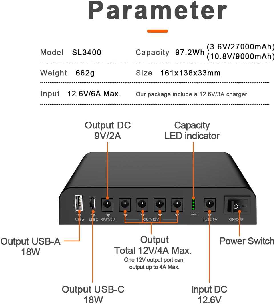 Specification Capacity: 97.2Wh(3.6V/27000mAh)(10.8V/9000mAh)Output:DC5521 9V/2A 12V/4AUSB-A 18WUSB-C 18WSize:164x120x51.5mm