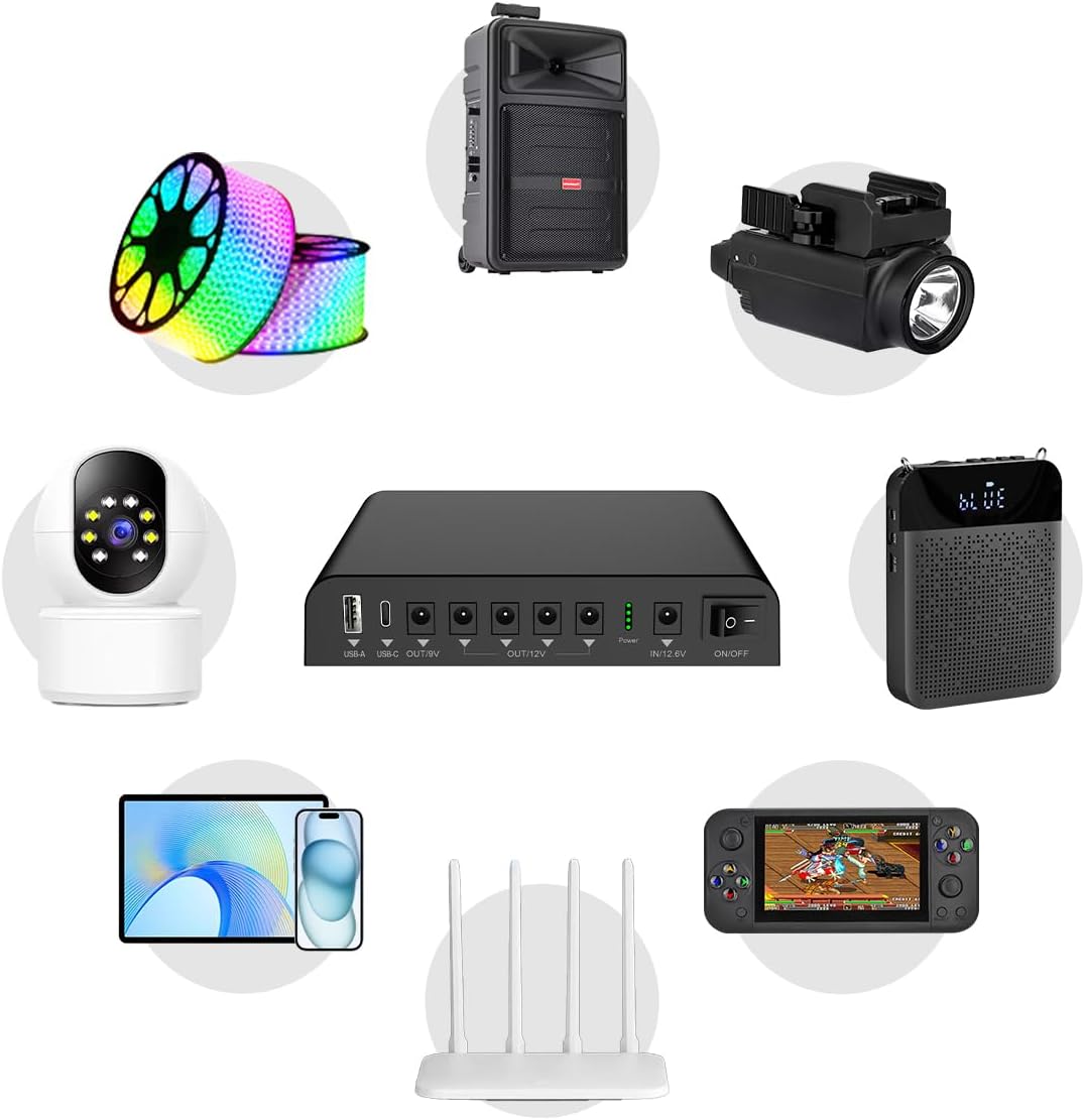 Mini uninterruptible power supply back up battery pack can power for most 12V/9V/5V DC equipment, wireless routers, telephone, LED strip,monitor cameras, etc. It can provide hours of operation during power failure.