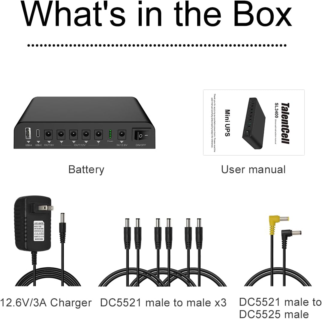 9 reviews for TalentCell Mini UPS Uninterrupted Power Supply 27000mAh 97.2Wh Lithium ion Backup Battery Pack with DC 12V/9V and 18W USB-A/USB-C PD Output for Router/Modem/LED Light, CCTV Camera, Smartphone and more