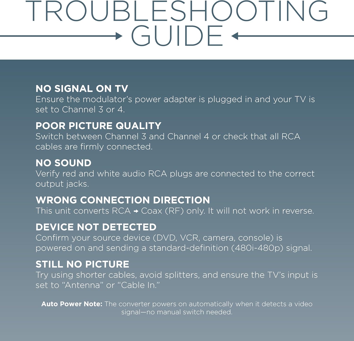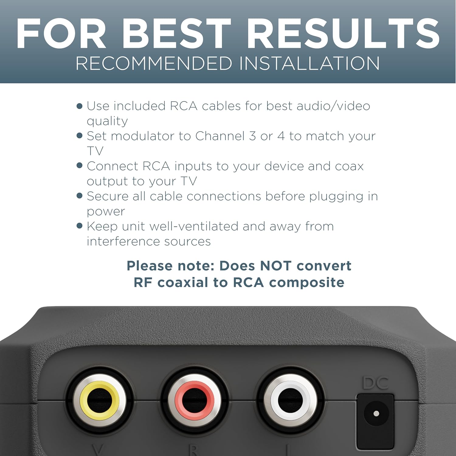 Strong Construction: This digital modulator for RCA to coax features a compact design that is portable, lightweight, and made to last.
