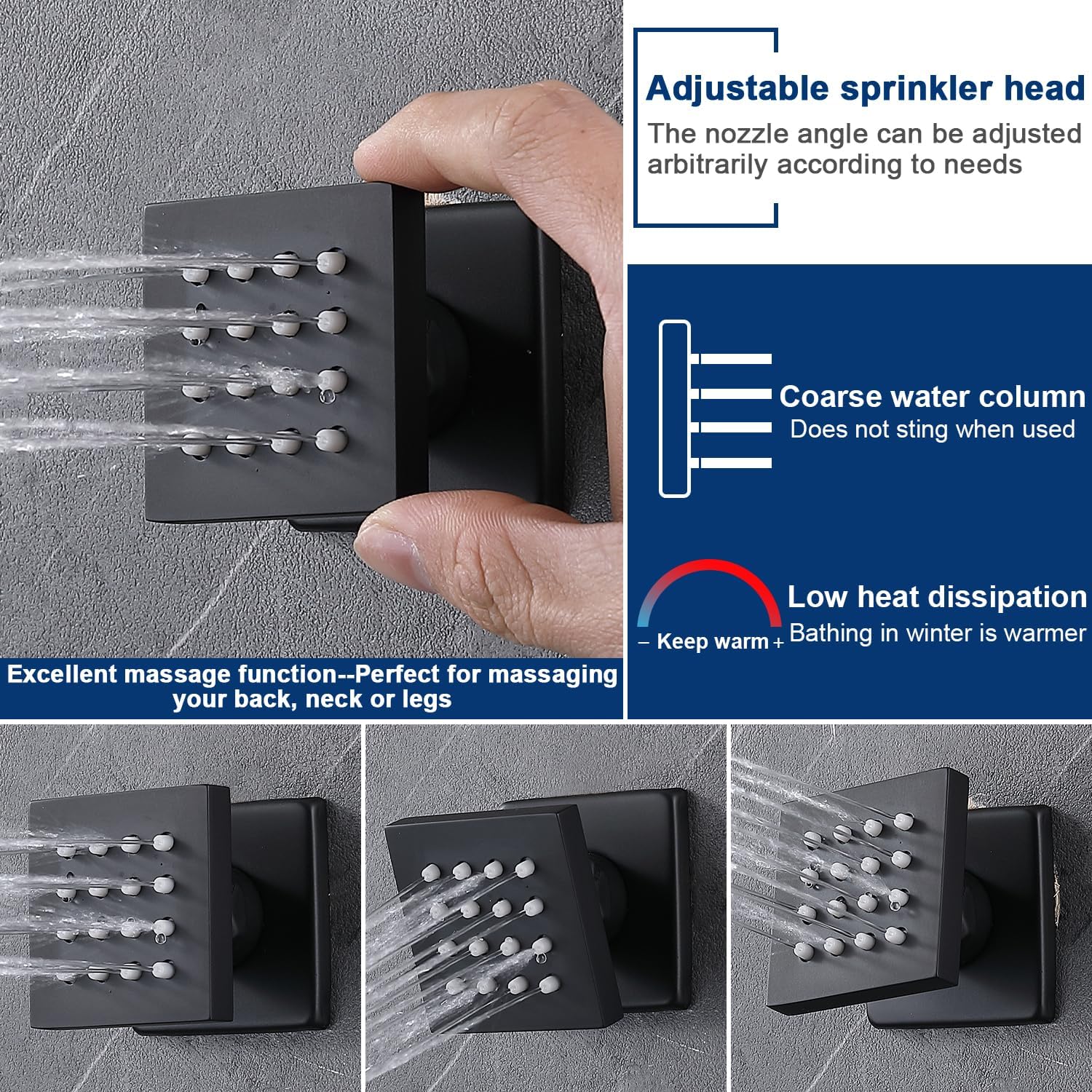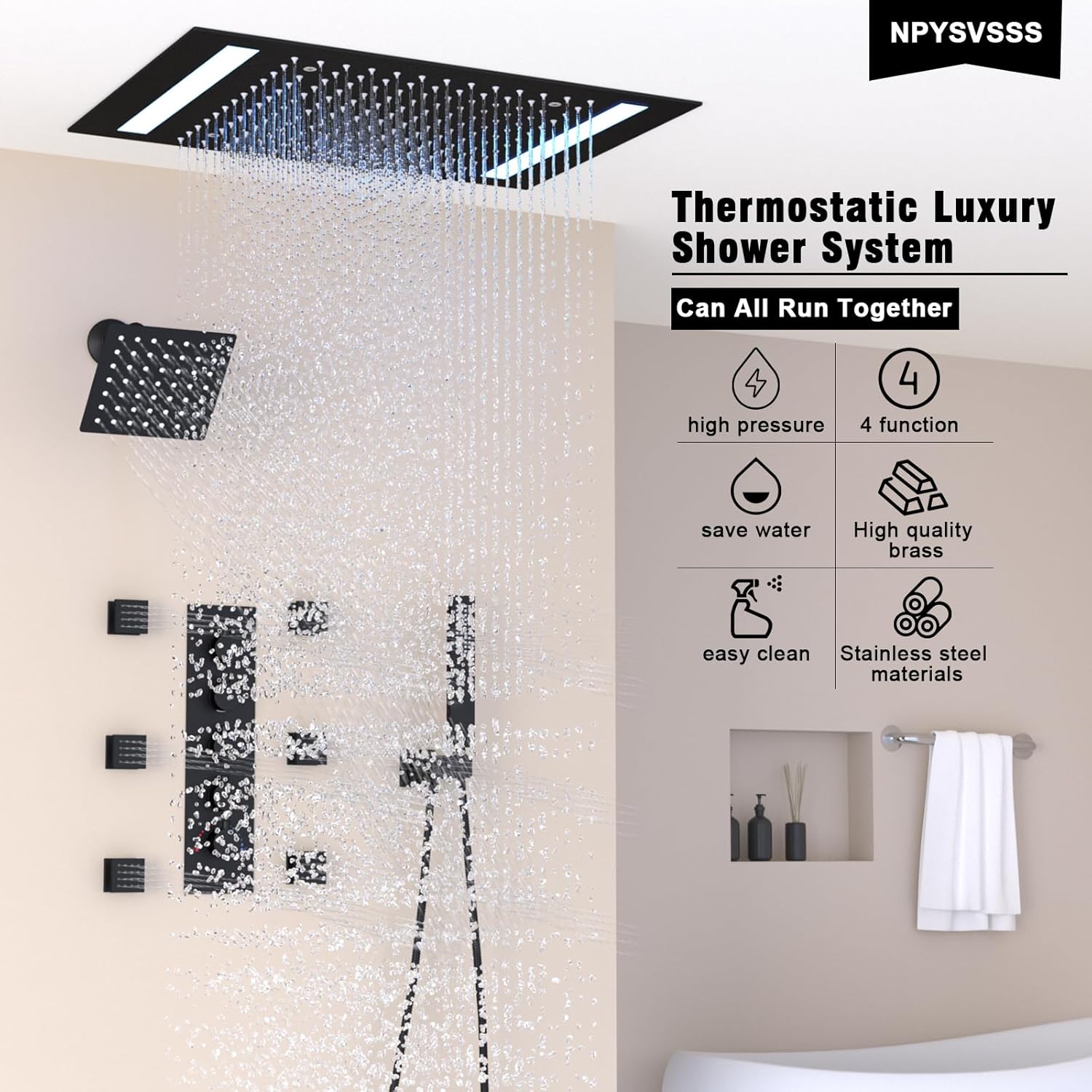 UPGRADED THERMOSTATIC SHOWER VALVE: Can use 1 to 4 functions at the same time. This model compares well with other models in that each of the 4 options is controlled individually, so you can turn each option on/off and control the water flow independently, powerful full-body spray with a strong stream of water to meet your showering needs. Let you relax and enjoy your shower time.