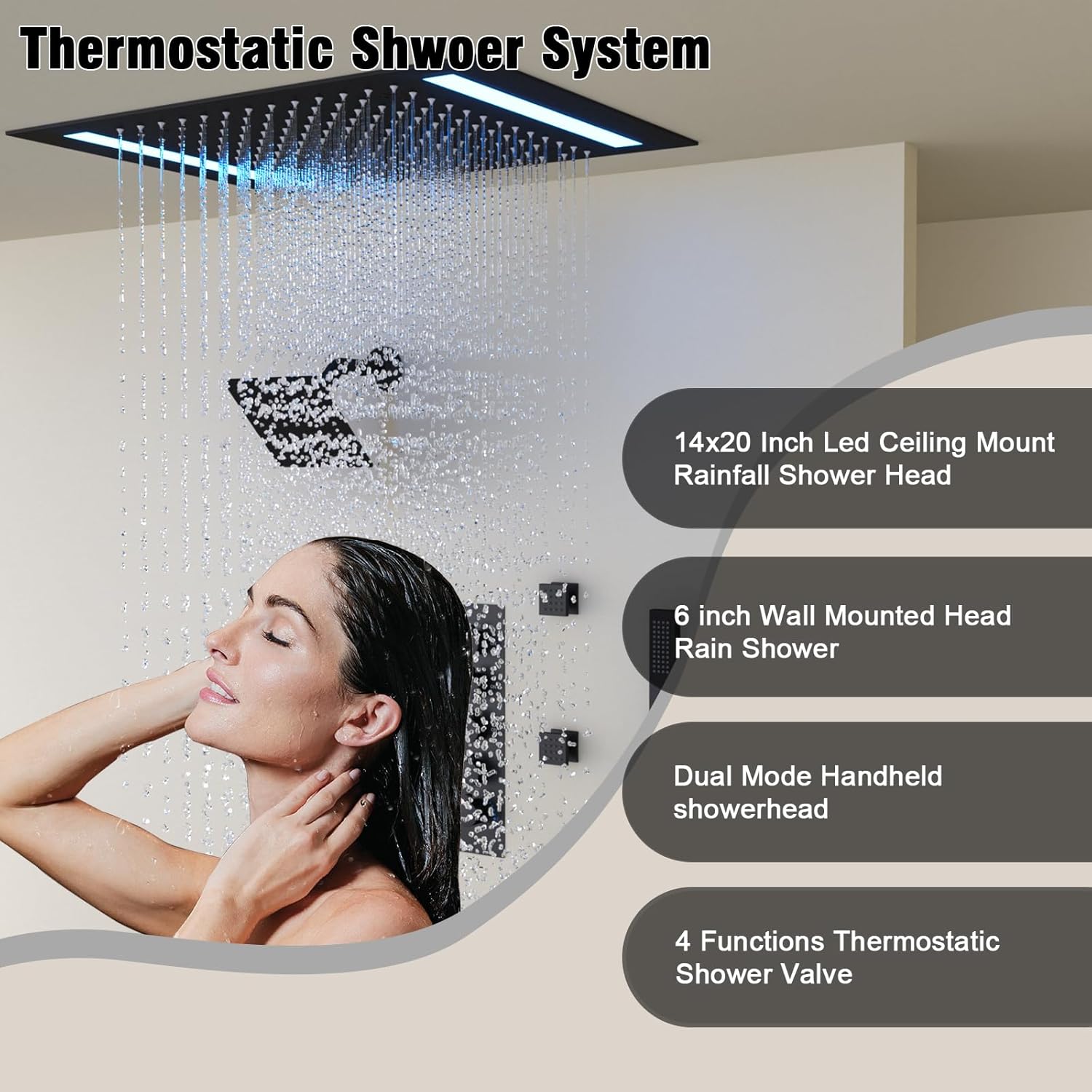 Thermostatic Shower System with 14×20 Inch Ceiling Mount LED Head & 6 Inch Wall Head and Handheld Shower 4 Function Vale with body jets Can All Run Together, Matte Black