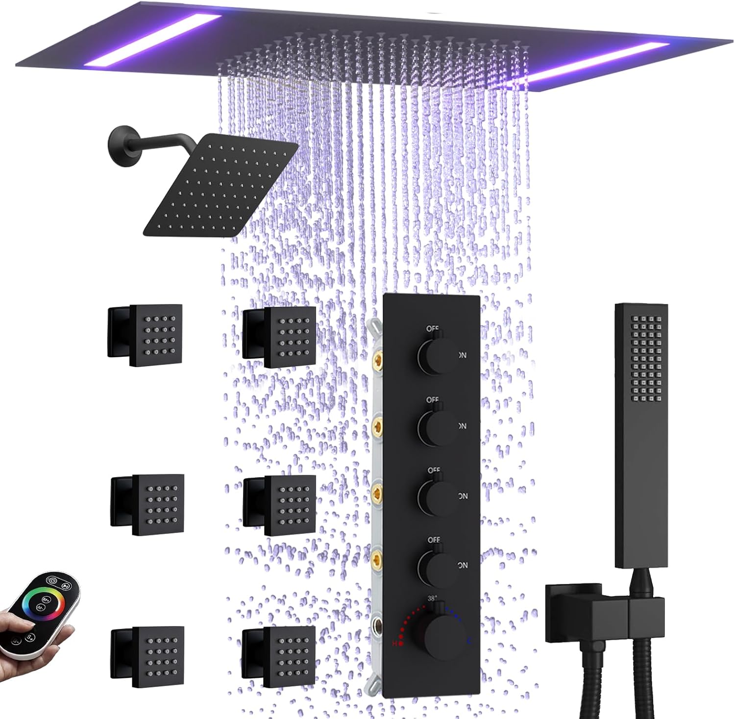 3 reviews for Thermostatic Shower System with 14×20 Inch Ceiling Mount LED Head & 6 Inch Wall Head and Handheld Shower 4 Function Vale with body jets Can All Run Together, Matte Black