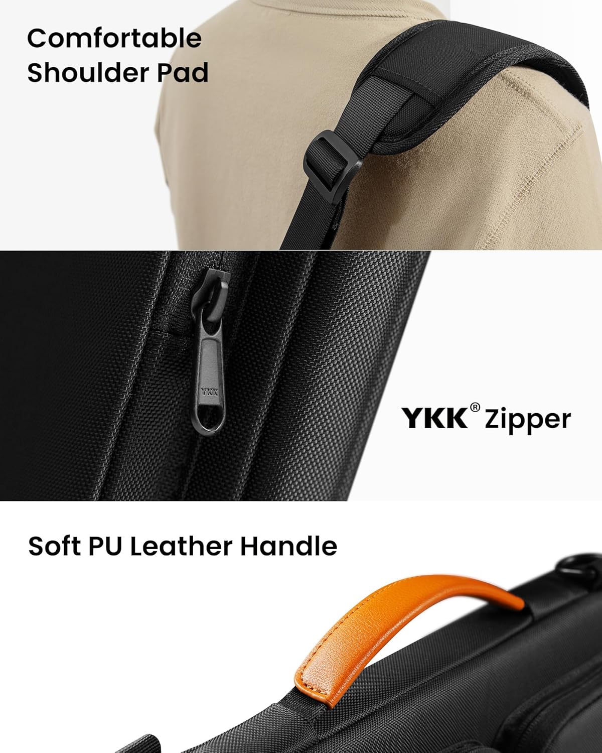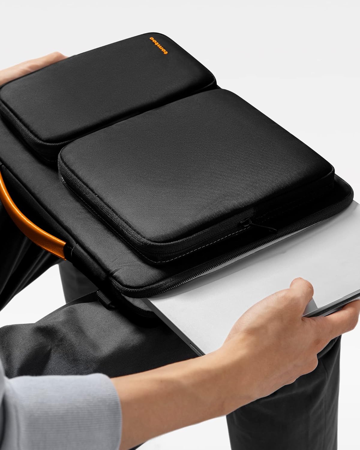 Smart Tri-compartment Storage System: The laptop case has two separate compartments with several small pockets and a strap for Airtag or key. It can keep your electronic accessories, such as charger, cable, USB hub, Kindle, etc., stay organized. In addition, a hidden pocket on the back allows you to store your personal belongings for easy access while remaining secure