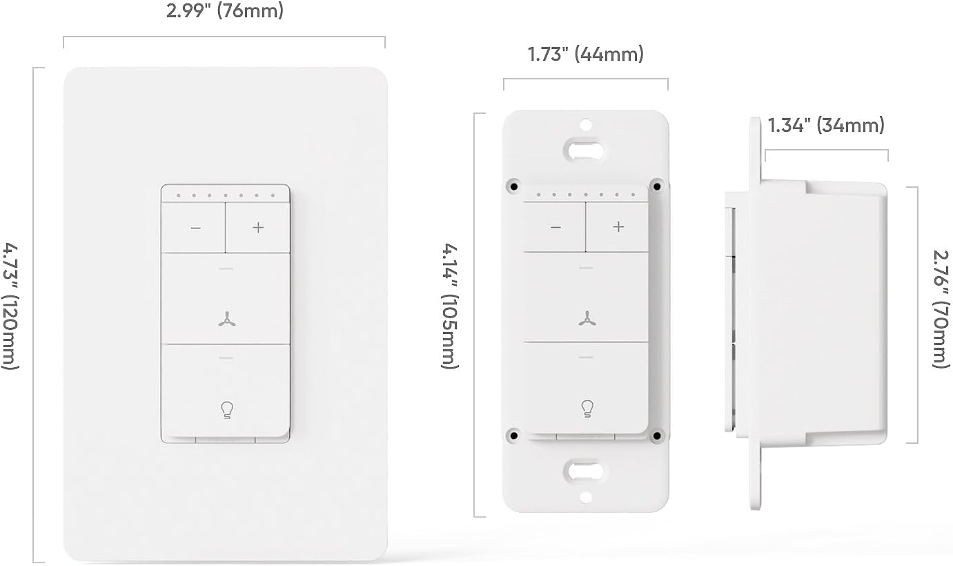 Note: Designed for stable 2.4GHz Wi-Fi connections only (5GHz not supported). No hub required. A neutral wire is required, and a complete wiring setup must be present, including fan load, light load, line, and ground wires. The fan and light must each have their own independent load wire; shared load wiring is not supported. This switch supports single-pole installations only and is not suitable for 3-way or multi-way configurations. Switch dimensions: 4.13″ (L) × 1.73″ (W) × 1.38″ (D)