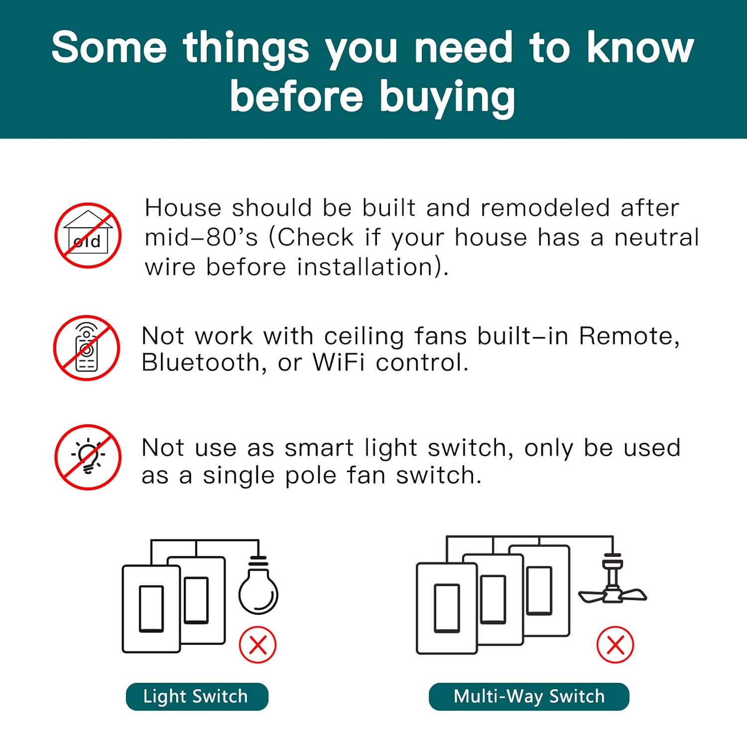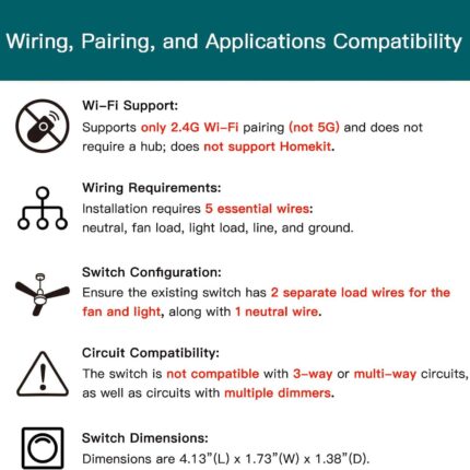 Friendly Reminder: Requires a neutral wire. It only works with a 2.4GHz Wi-Fi connection (not 5GHz). Designed for single-pole fan control only (not compatible with 3-way circuits). Please note, this switch is for ceiling fans only and does not support lighting control. Includes a 1-gang standard wall plate and a screwless snap-on wall plate. Faceplate: 4.72″(L) x 2.99″(W). Switch box: 4.14″(L) x 1.73″(W) x 1.34″(D)