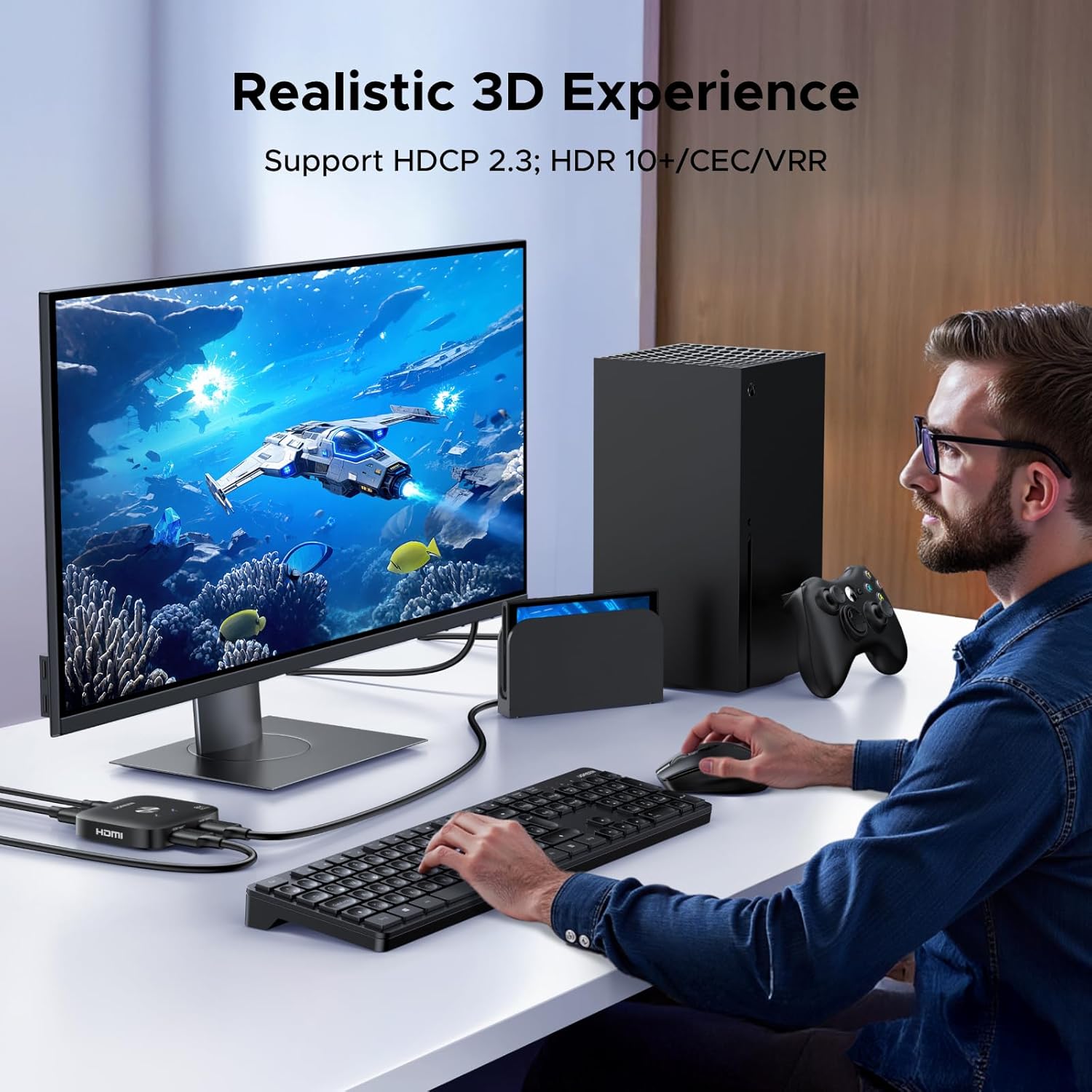 Ultra-HD 8K Resolution: This HDMI 2.1 switch is perfect for gamers, supporting 8K@60Hz, 4K@240Hz, 4K@120Hz, and backward compatible with 1080P@240Hz resolutions. This HDMI switch 2.1 also supports HDMI 2.1/2.0/1.4, VRR, and Dynamic HDR, and Dolby Atmos & HDCP2.3. NOTE: To achieve the high-resolution 8K@60Hz, please make sure that your HDMI cables, monitor and graphics card all support 8K@60Hz, and we recommend that you use a certified HDMI 2.1 cable that is less than 9.9ft AWG28